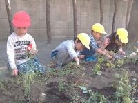 子どもたちとシロツメクサの種をまきました。種がとても小さかったので、一つの穴に持っている種を全部入れてしまったうさぎ組さんに「ひとつずつだよ」と教えてくれるぞう組さんの姿もありました。