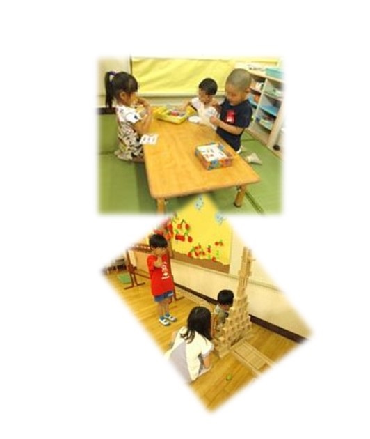 朝・夕保育の時は、みんなの部屋で異年齢の子どもたちが一緒に過ごしています。他学年の友達の顔や名前を覚え始め、ままごとや積み木などで一緒に遊ぶ姿が見られるようになってきました。