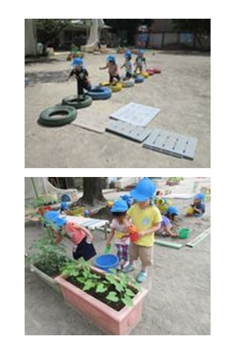 園庭には、タイヤや板、バスマットなどの遊具があります。それらを保育者が組み合わせて、遊ぶ場を作りました。平らでない不安定な道を、バランスをとりながら歩き、繰り返し楽しんでいました。