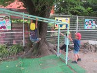 「先生、うんてい見てくださ〜い!」という声がかかり、ぞう組・うさぎ組一緒に並んで待っています。ぞう組さんが上手にできる姿に憧れのまなざしのうさぎ組。ぞう組さんから「ぶら下がっていたらできるようになるよ。」と励まされたり、「ぞう組さんは足がこうなっている。」とうさぎ組は観察していたり、互いに関わり、刺激を受けて遊んでいる姿が見られます。