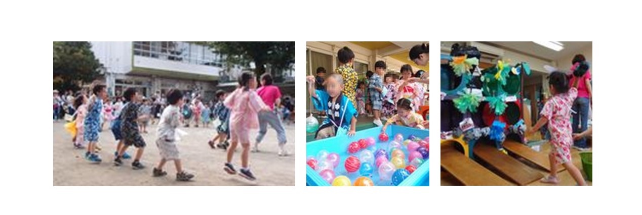 お天気が心配でしたが、園庭で元気いっぱい盆踊りを踊ることができました。ヨーヨーつりや、年長組が作ったゲームコーナー、お面作り、2階ホールには、魚釣り、水族館迷路などお楽しみが盛りだくさん!楽しいひと時でした。保護者のお手伝いのご協力ありがとうございました!