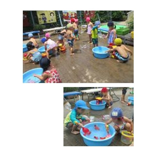 タライで水遊びをしました。カラービニールで作った金魚をひしゃくですくったり、バケツに水を入れたり出したりし、水の感触を楽しんでいました。