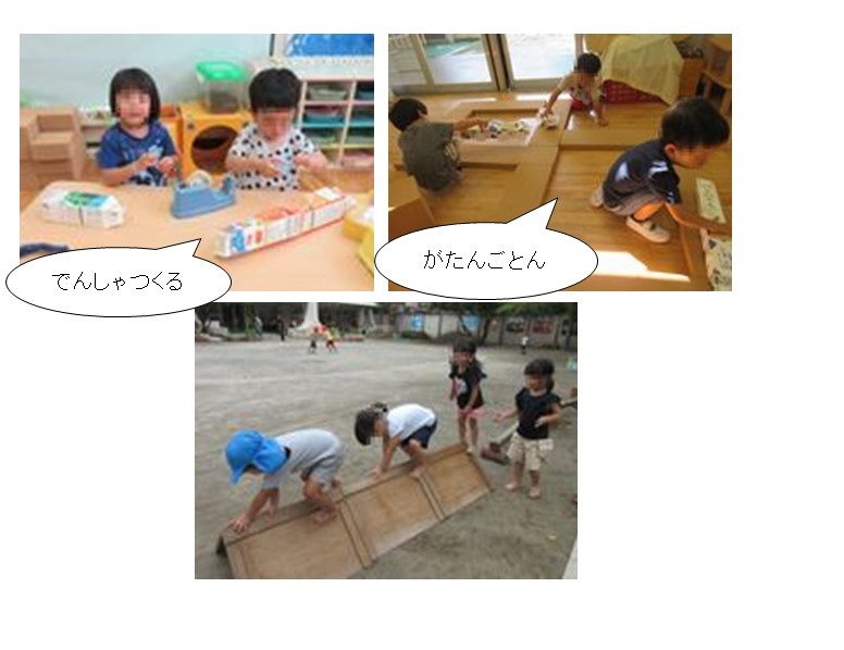 2学期に入り、空き箱製作をしています。子どもたちの小さな気づきや発想を大切にし、やりたい気持ちを尊重し、自分の力でやってみようとする姿を見守っています。また、作ったものを遊びに使い、遊びの中の子どもたちの世界がどんどん広がっています。