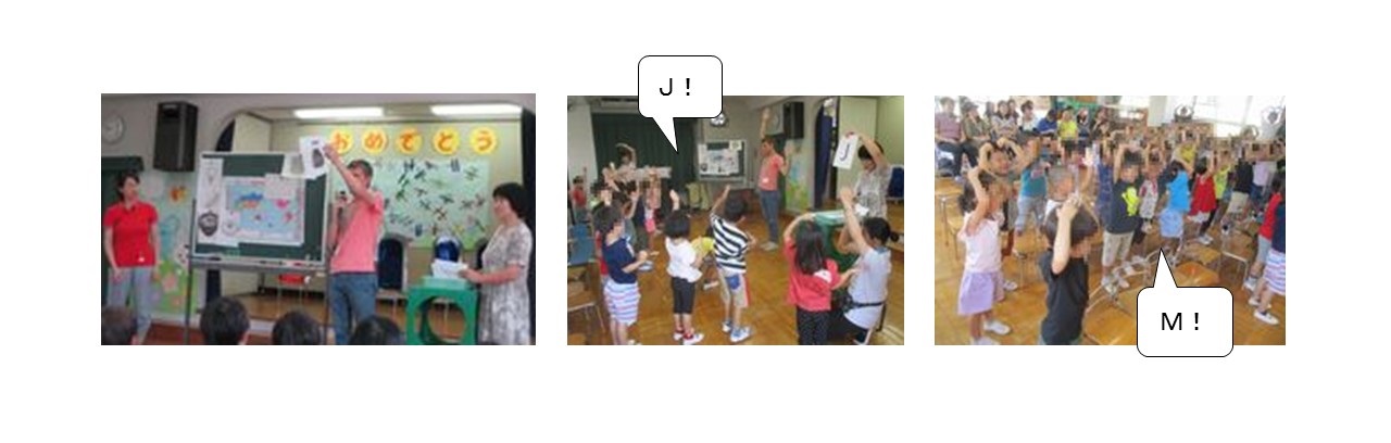 夏休みに誕生日を迎えた幼児を祝う8月の誕生会は、9月に行われます。“オリンピック・パラリンピック教育”の一環として、異文化に触れる経験になるように、在園児保護者の「ジョーさん」にお楽しみをしていただきました!アメリカのことを教えてもらったり、英語で誕生児にインタビューをしてもらったりしました。最後は、アルファベットを全身で表現することを楽しみました。ダイナミックな動きに子どもたちもノリノリで参加していました。