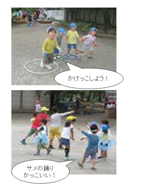 運動会後も、子どもたちから「運動会ごっこしよう。」「かけっこしよう。」という声が聞かれました。うさぎ組・ぞう組が踊っていたリズムを教えてもらいながら、繰り返し踊っている様子が見られました。