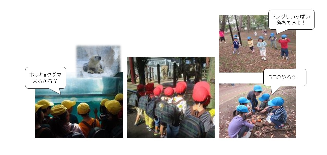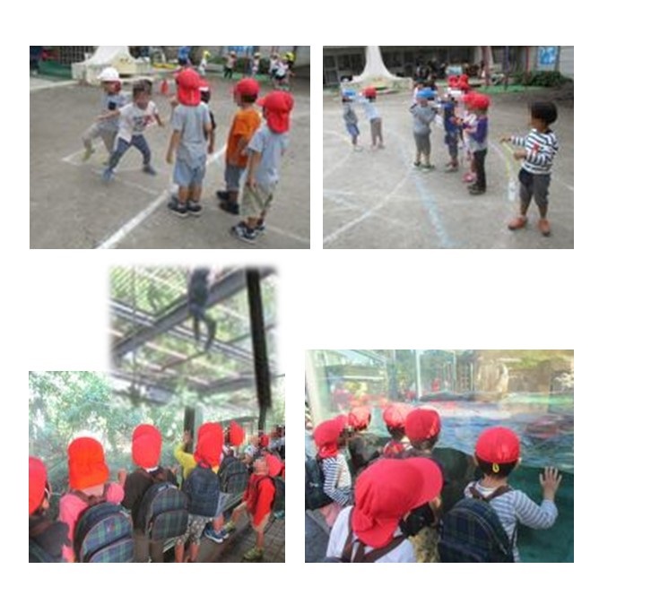 うさぎ組・ぞう組は、大型バスに乗って上野動物園に行きました。たくさん動物を見て、モノレールに乗って、みんなでお弁当を食べて、楽しい一日でした。ことり組は、お弁当を持って宮前公園に行きました。お土産にドングリや落ち葉をいっぱい拾いました。たくさん歩いて疲れたけど、自然に触れ合うことができた一日でした。