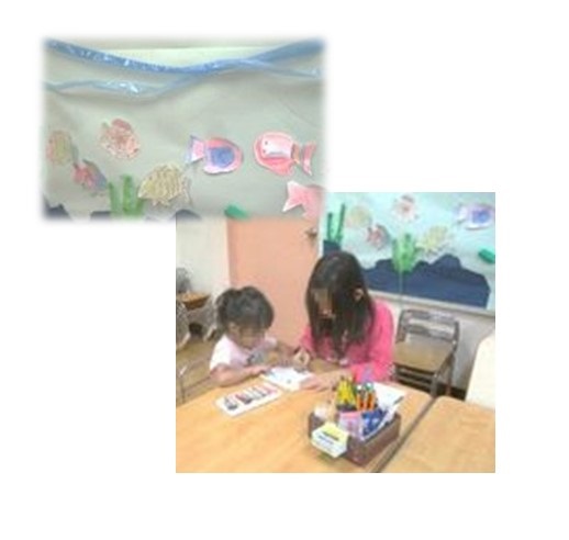 “海のオリンピック”を再現して、魚のぬり絵を楽しんでいます。ことり組は、うさぎ組やぞう組の塗り絵を見ながら色を塗り「わかめ食べてるの。」と言いながら、魚を泳がせています。色とりどりのきれいな魚たちが、海を泳いでいました。
