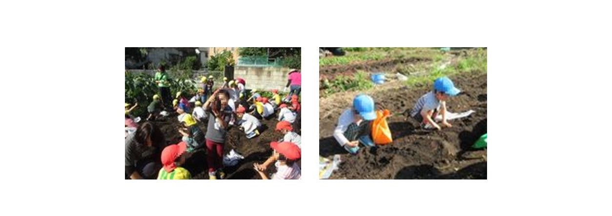 近隣の内藤さんの畑にさつま芋掘りに行きました。みんなドキドキ、ワクワクし、どんなさつま芋が掘れるか楽しみにしている様子でした。内藤さんに挨拶をし、一人二株を素手で一生懸命掘りました。大きなさつま芋がたくさん収穫できました。