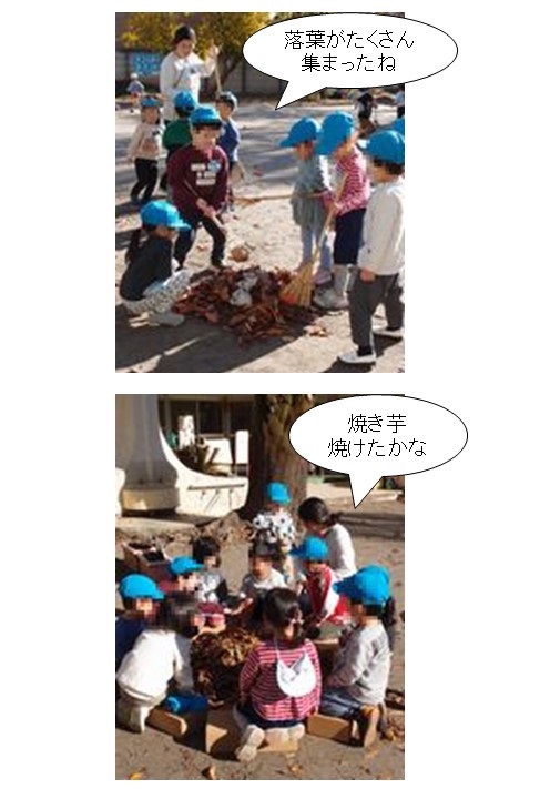 園庭の木々の葉も色づき始め、ザクロの葉が色鮮やかな黄色になってきました。熊手を使って、子どもたちと落ち葉を集めて“たき火ごっこ”をしました。どんどん大きくなる落ち葉の山の中に、丸めた新聞紙を焼き芋に見立てて入れて、焼いたり食べたりする真似をして遊びました。