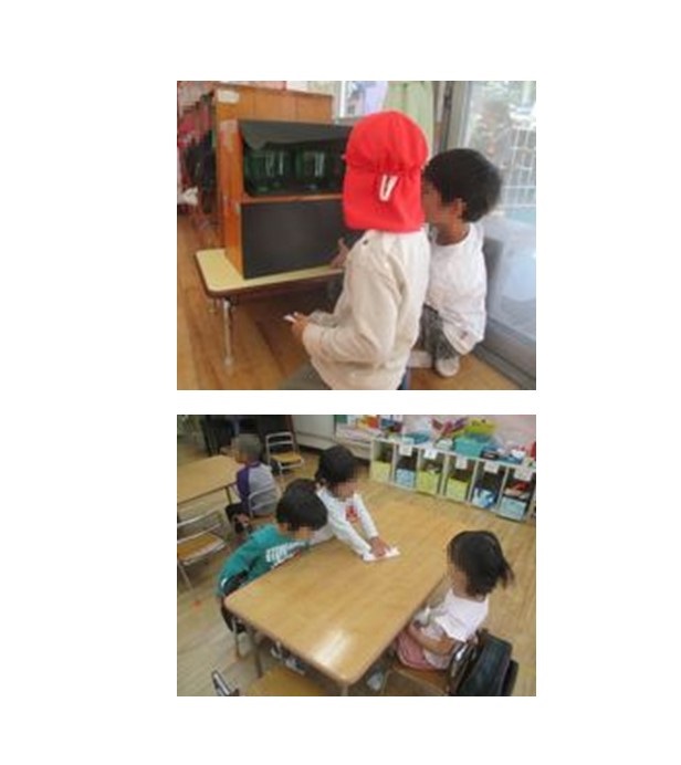 自分で布巾をしぼってグループのテーブルを拭いています。自分の当番が回ってくることを楽しみにしています。