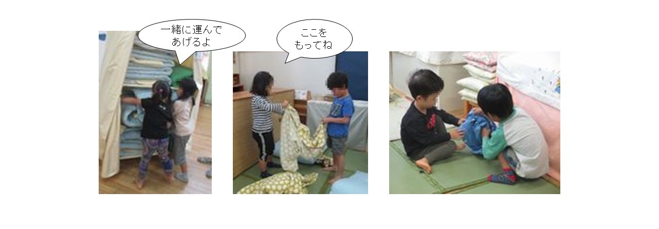 ぞう組の午睡がなくなって1ヶ月が経ちました。うさぎ組とことり組のお昼寝が終わる時間になると、ぞう組が起こしに来てくれます。布団運びや、シーツ外しを一緒に手伝ってくれます。