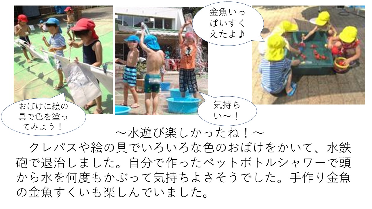 昨年までとは少し違った夏休みとなりましたが、暑さに負けず、水遊びなどで元気いっぱい遊びました。