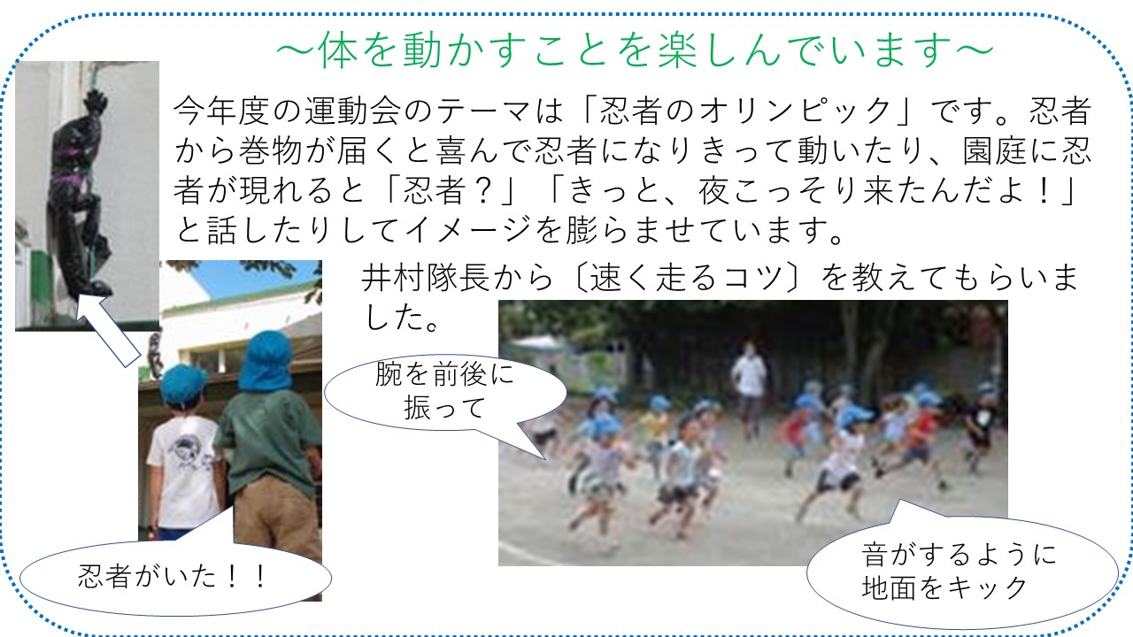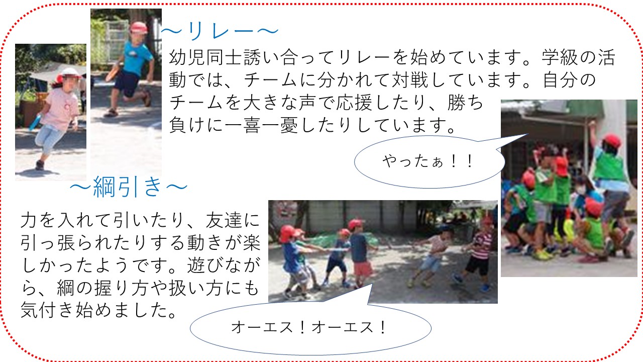 運動会に向けて走る、引く、踏ん張るなどいろいろな体の動きを繰り返し経験しています。保育者も一緒に取り組む中で、思い切り体を動かす気持ちよさを感じています。