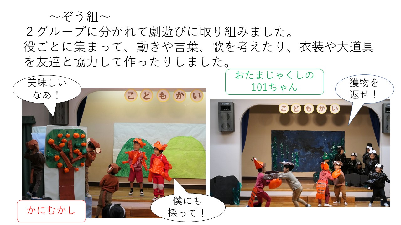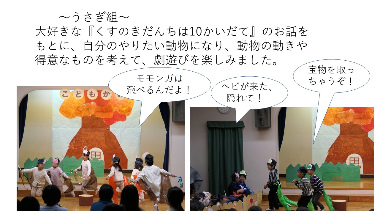 12月5日(土)に、年中うさぎ組、年長ぞう組の劇遊びをしました。コロナ感染拡大防止対策のため、各家庭1名の保護者の方に参観していただきました。