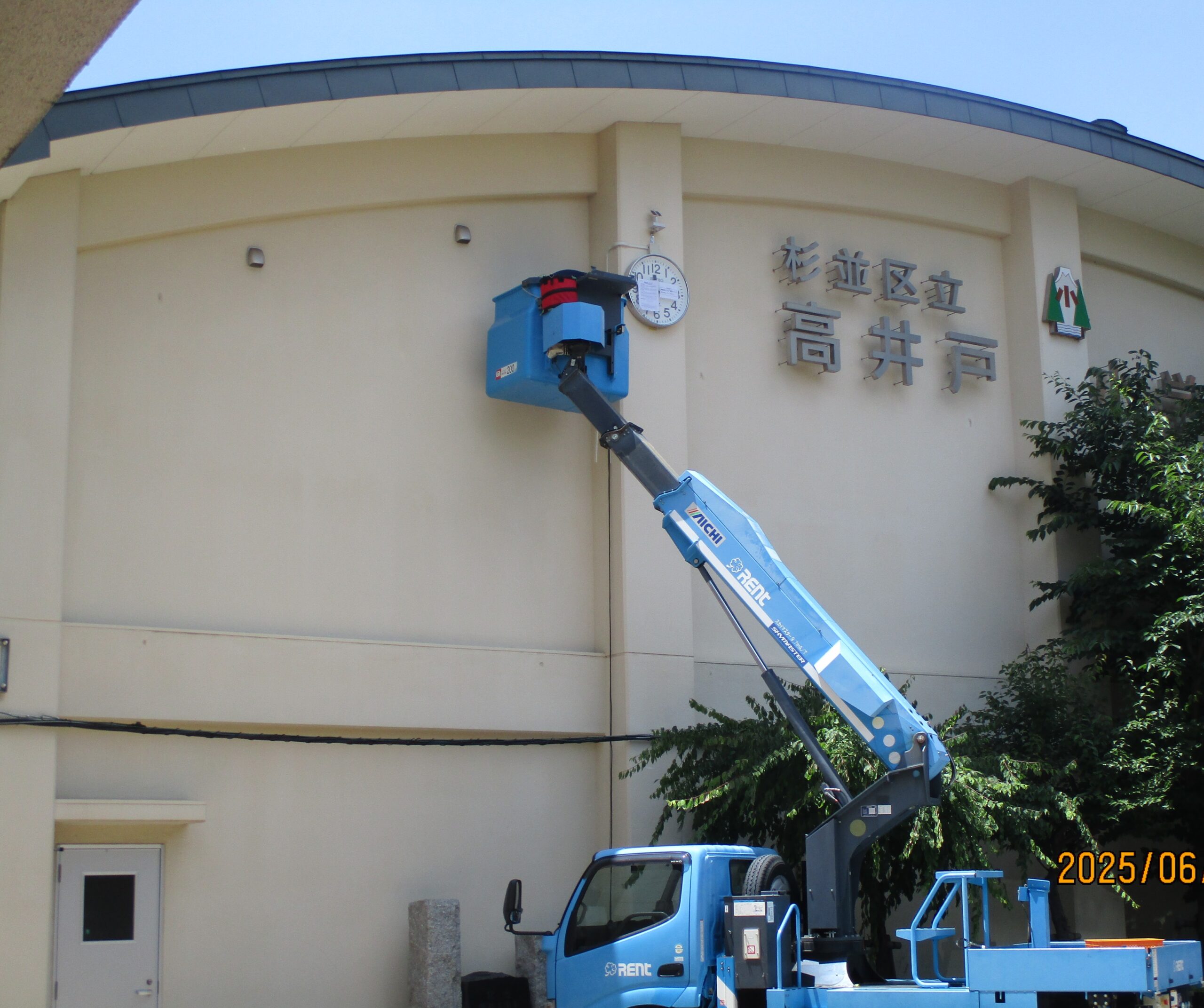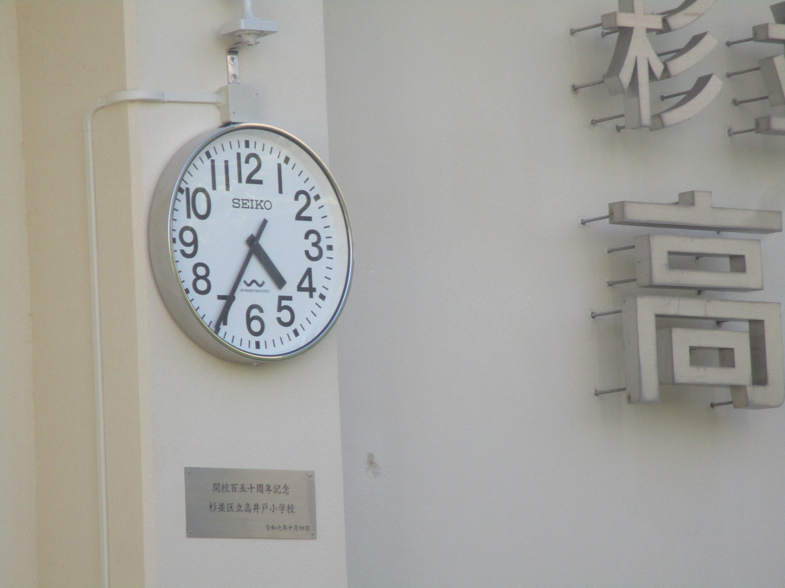令和7年6月5日、体育館壁面(環状8号線側)に時計が設置されました。登校してくる児童だけでなく、高井戸小の正門前を行き交う地域の方々にも、時刻を伝えています。高井戸小に、新しいシンボルが生まれました。