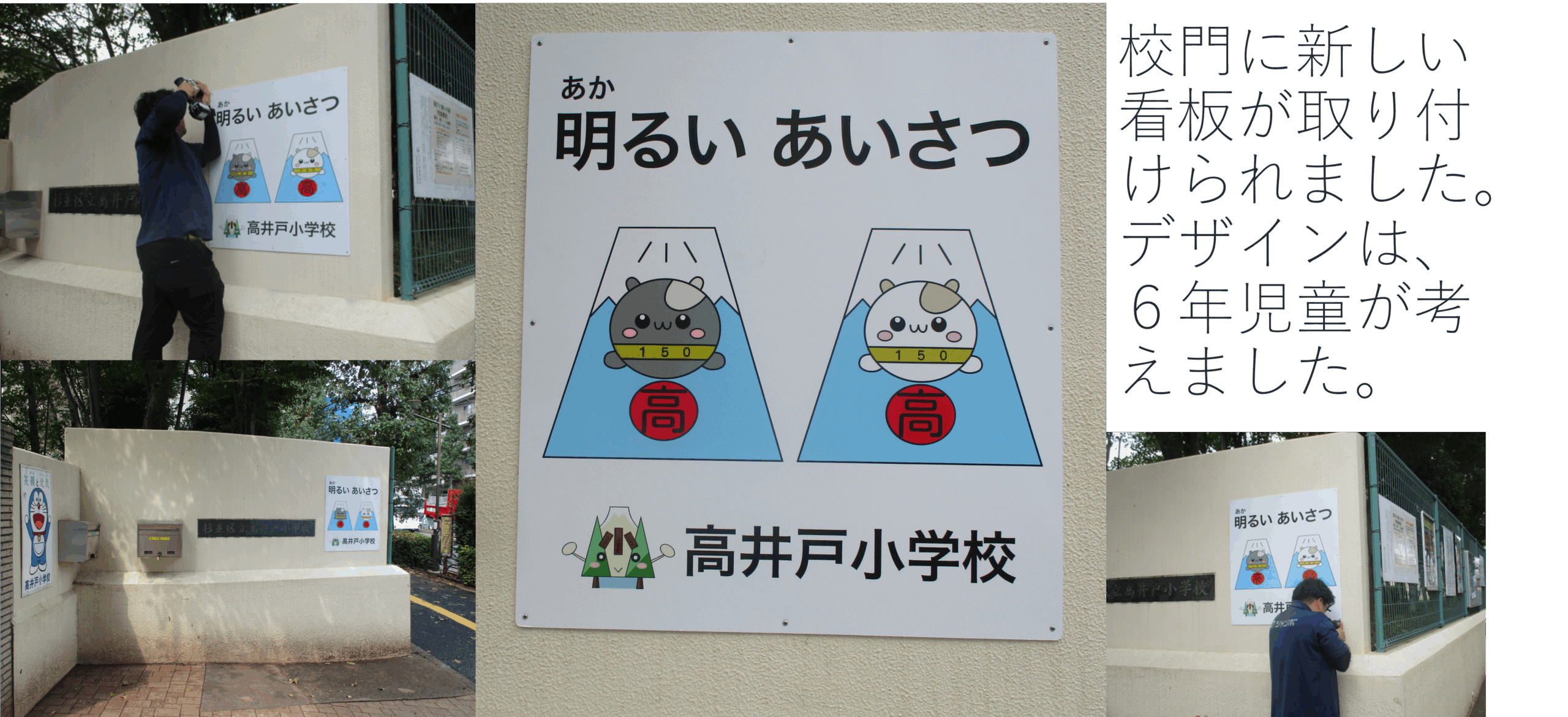 ㉗ 令和7年9月9日(火) 周年行事に向けた6年生の取組の成果として、校門に新しい看板が取り付けられました。6年生のプロジェクトのひとつ、マスコットチームの6年児童が発案し、校長先生に設置の許可をもらい、デザインを考えてきたものが実現しました。