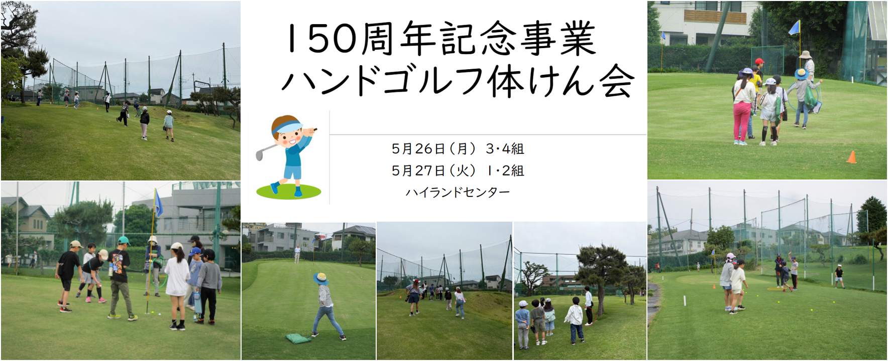 ⑯ 令和7年5月26日(月)、27日(火) 150周年記念事業の一環として、3年生がハンドゴルフ体験を行いました。近隣にある「ハイランドセンター」を訪れ、広々とした芝生のコースを、7コースも回らせていただきました。