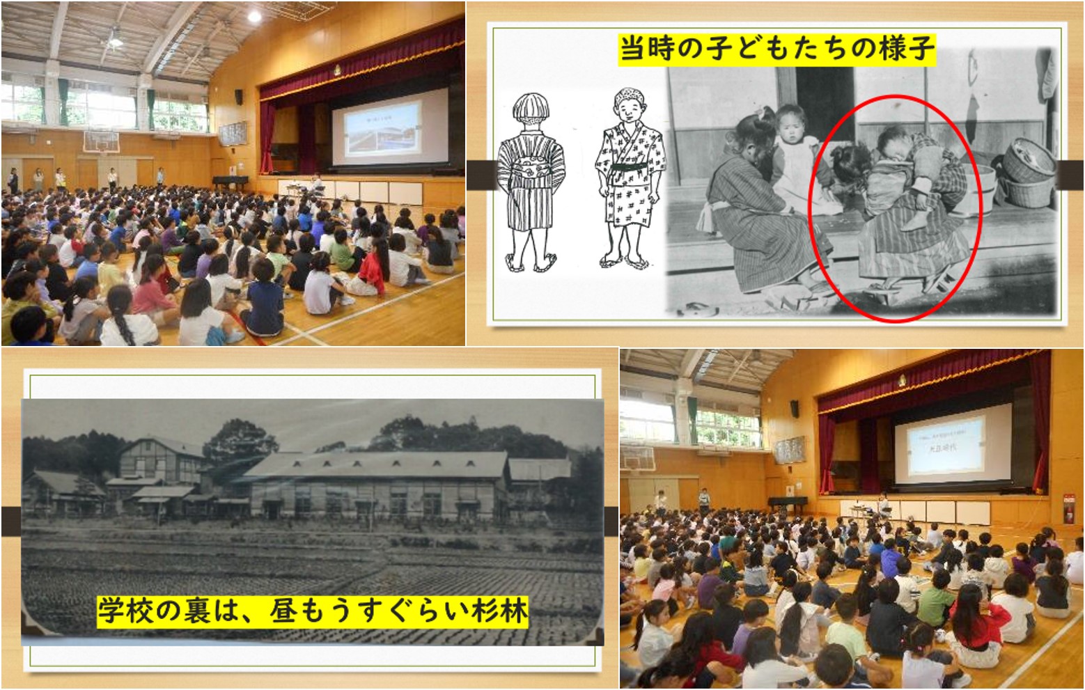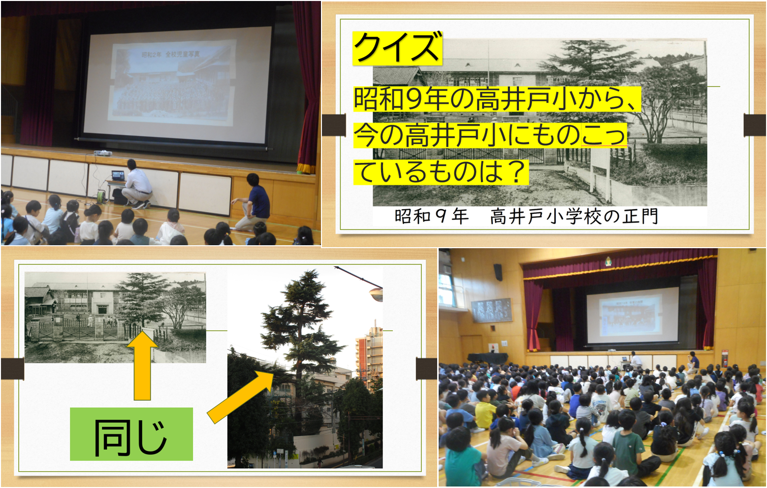 ⑲ 令和7年6月10日(火) 全校朝会の時間に、高井戸小150年の歴史を学びました。3回めとなる今日は、昔の写真をもとに、昭和時代前期の学校の様子、周辺の様子を学びました。