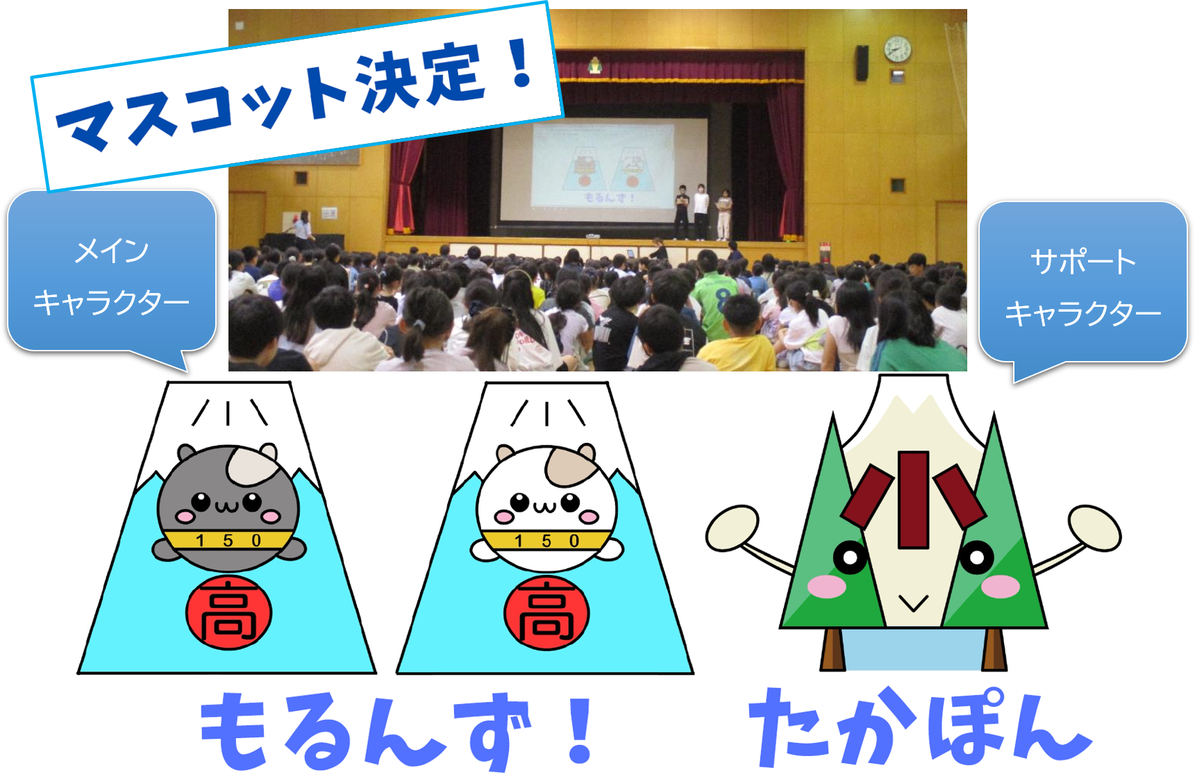 ⑳ 令和7年6月10日(火) 全校朝会の時間を使って、高井戸小150年周年記念のマスコットキャラクターが6年生から発表されました。6年生の児童がアイディアを出し、全校児童の投票で決定しました。「おーっ!」という歓声も起き、拍手で迎えられました。