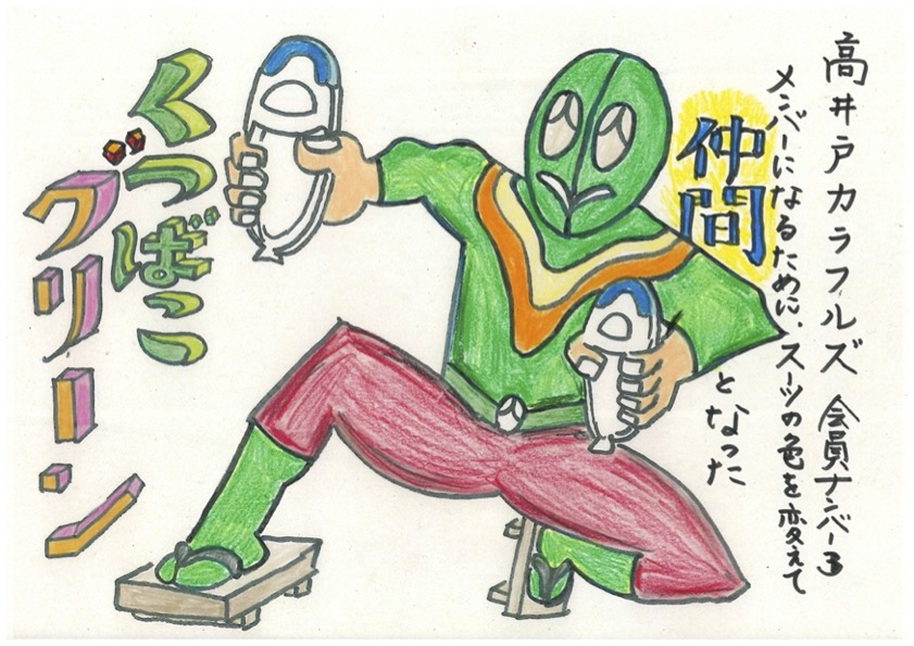 高井戸カラフルズ 会員ナンバー3「くつばこグリーン」加入!! 投稿日 2023年2月14日 更新日 2023年3月6日 著者 takaido-shokuin カテゴリー お知らせ カテゴリー 学校活動 カテゴリー 生活指導 「拙者(せっしゃ)、『くつばこクリーン』として活動してきたが、どうしても高井戸カラフルズのメンバーになりたかったので、みどりのスーツに着替えて『くつばこグリーン』として活動することになった。引き続き、美しいくつばこを心がけてほしいのじゃ。」