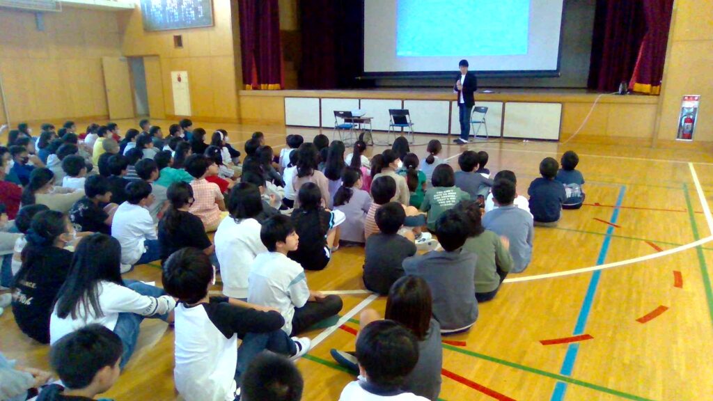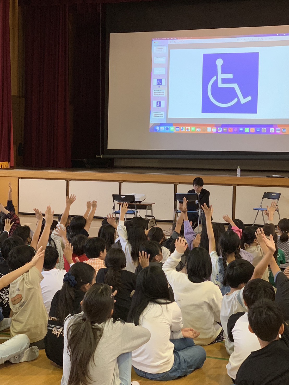 4年生は、総合的な学習の時間で「自分たちにできること~ちがいを大切に~福祉」を学んでいます。1学期は高齢者福祉でしたが、2学期は、体の不自由な方々を通した福祉について考えています。この日は、奥田元PTA会長をお招きして、福祉に関係するマークについて、車椅子で生活する上で困っていることや、こんなときどうしたらよいか等自分たちにできることも考えながら、お話を聞きました。