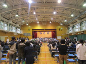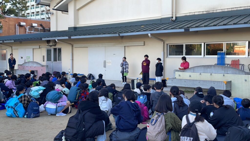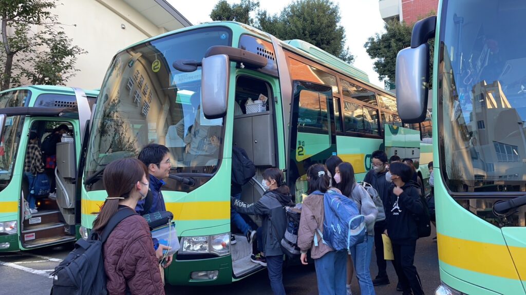 朝、7時過ぎに校庭で出発式を行い、伊豆に向けて出発しました。少し寒いですが大変良い天気です。