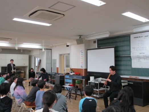 杉並区三曲協会の毛塚珠子先生(筝・三弦)、前田真希先生(筝)、瀧北榮山先生(尺八)をお招きして伝統音楽の出前授業を行いました。楽器の名前の由来や奏法など、いろいろなお話を毛塚尚明先生の司会のもとに学習しました。和楽器の響きが音楽室に広がり、伝統音楽に親しむことができました。