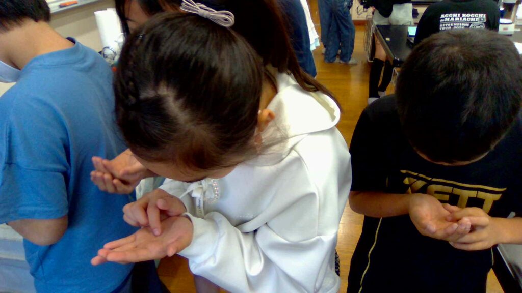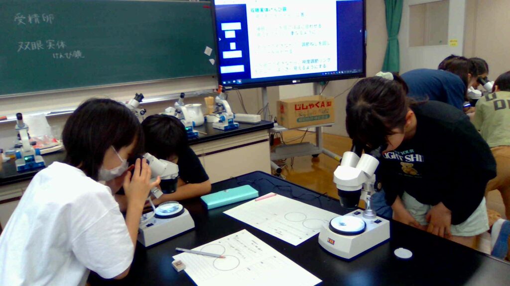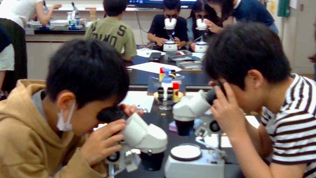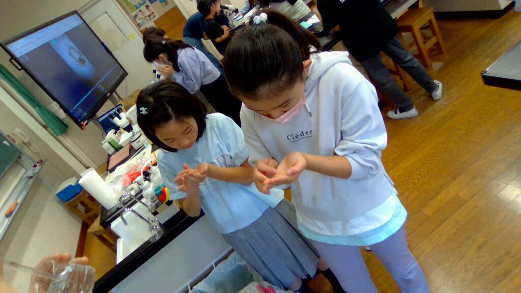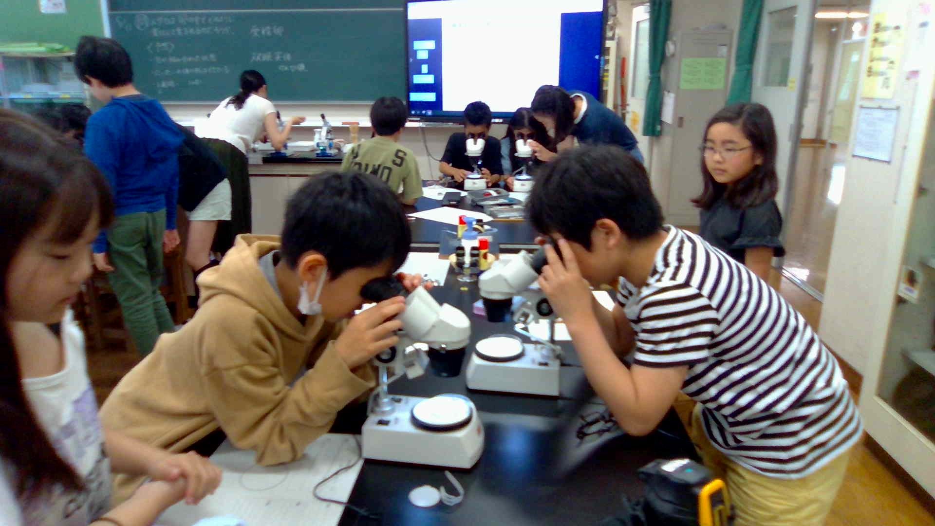 理科で「メダカのたんじょう」の学習をしています。4月の終わり頃、各クラスにメダカが届きました。水槽をメダカの住みやすい環境に整え、お世話を始めました。生き物好きはすぐに「先生~おすが〇匹で、めすが△匹です!」と、報告してくれます。まだメダカの体の特徴を学習する前ですが、みな興味深々で毎日水槽を覗いています。そんな中、たまごをお腹に付けたメダカを発見し大騒ぎ!あかちゃん用のネットにたまごを移して見守ります。 理科室では、たまごの観察を顕微鏡でさせてもらい、なんとたまごに触れることもさせてもらいました!「すごい血管まで見える~。」「心臓動いてるね。」「え~意外とたまごって固いんだね。」と次から次へと驚きと感嘆の言葉が出てきます。 やはり、実物を見て実感を伴った学習に勝るものはありませんね。 無事にたまがごが孵り、かわいいメダカの赤ちゃんが見られますように!