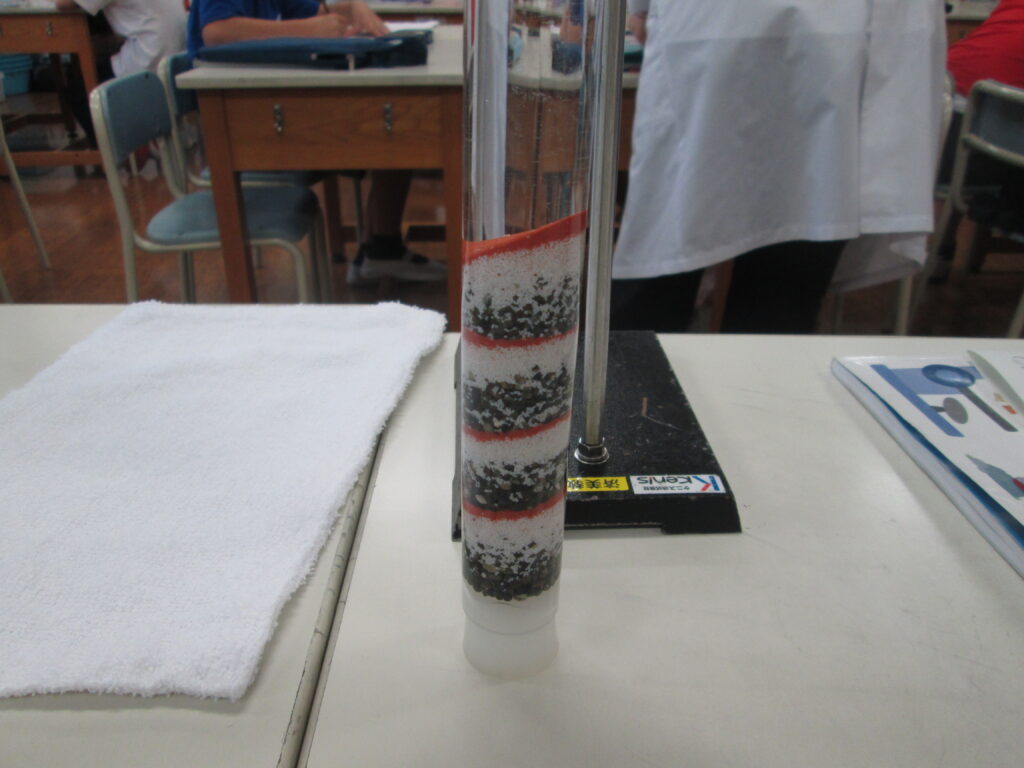 「地層は、流れる水のはたらきによってできるのだろうか。」という問題について、黒色、白色、赤色の粒を礫、砂、泥に見立て実験しました。