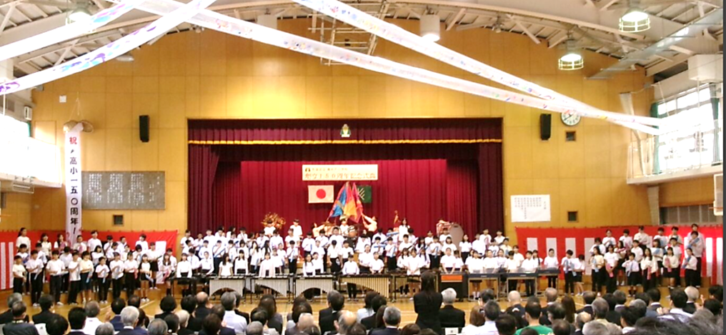 式典後の記念パフォーマンスでは、「150年の歴史をつなぎ、未来へはばたいていこう」という思いをこめて、合奏や合唱を行いました。6年生の立派な態度と素晴らしいパフォーマンスに、体育館が大きな感動と大きな拍手に包まれました。