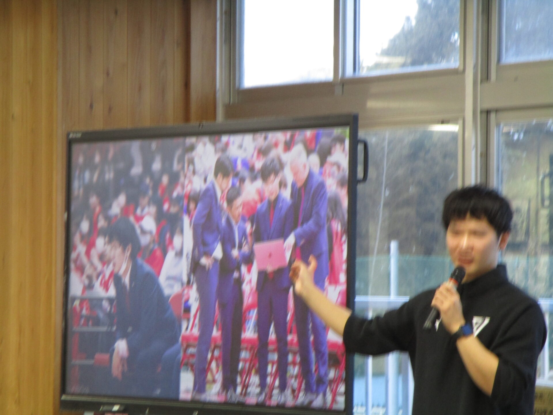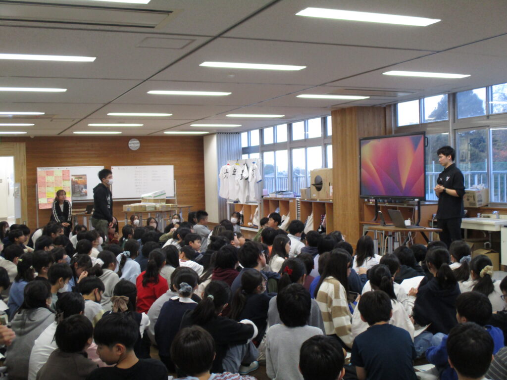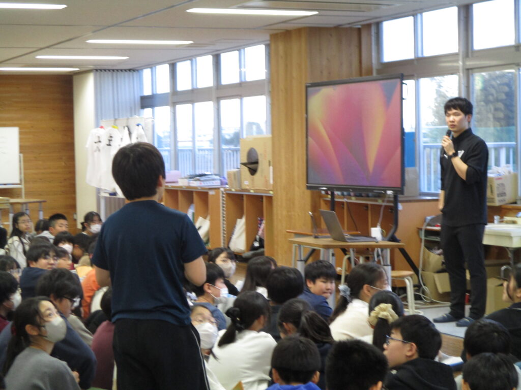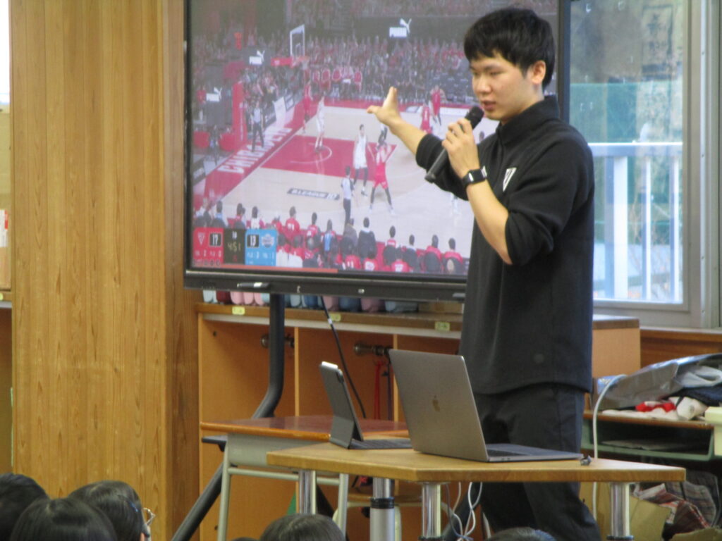 12月22日(月)6校時に千葉ジェッツ船橋のアシスタントコーチの半杭隆治さんを招聘し、お話を伺いました。半杭さんは、酒井先生の教え子という関係性で来ていただきました。将来「やりたい仕事」に就くためにどのようなアプローチや心構えが必要なのか、詳しく教えていただきました。