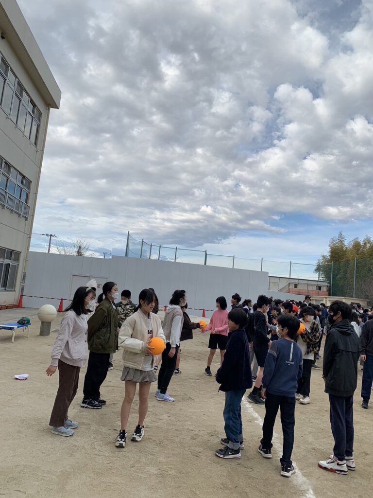 1月19日(金)の朝の時間に全校児童が校庭に集まりクラス対抗ボール送りゲームをしました。クラスが1列になり、前から後ろにボールを手渡しして送りまた折り返して前に送り返す早さを競います。集会委員が主催しとても盛り上がりました。
