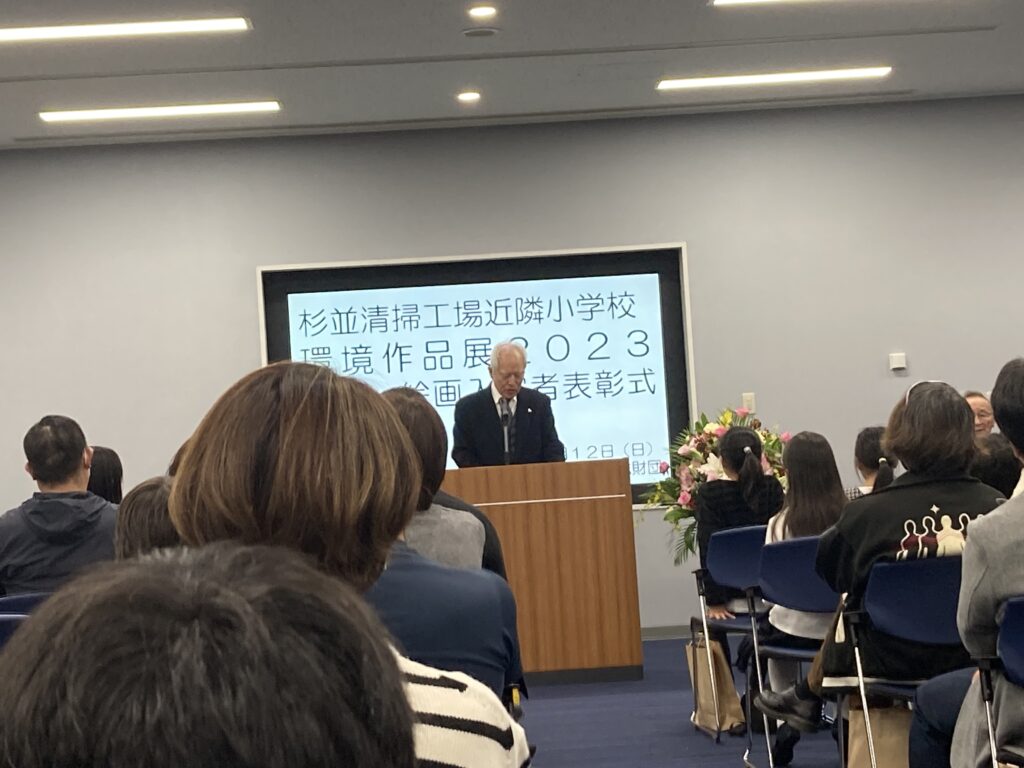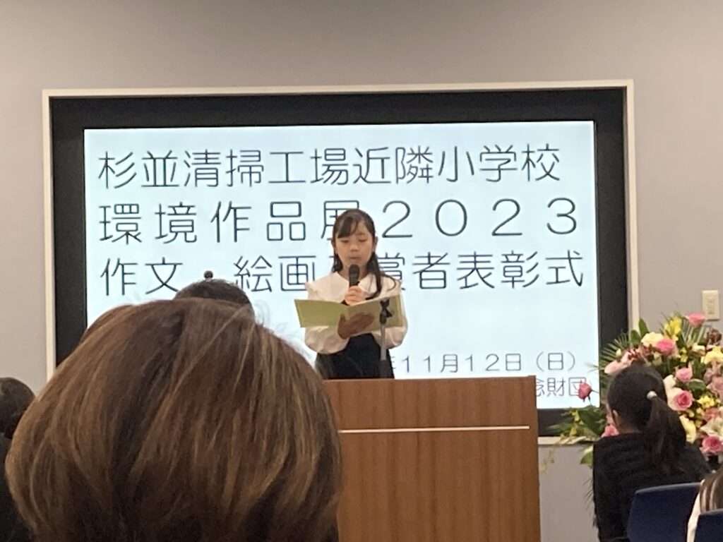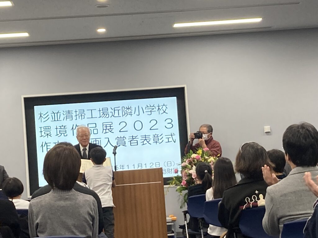 杉並清掃工場環境作品展2023 11月12日(日)杉並清掃工場見学者説明室で今年、近隣校4年生から出品された絵画や作文の優秀作品についての表彰式が行われました。高井戸小からは、総勢21名が表彰されました。