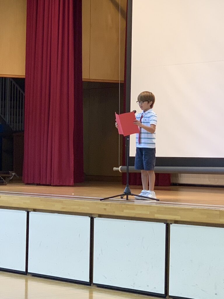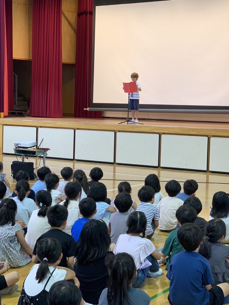 児童代表の言葉は、3年生の安藤 旭さんが1学期頑張ったことを堂々と発表しました。全校児童と先生たちから大きな拍手をもらいました。