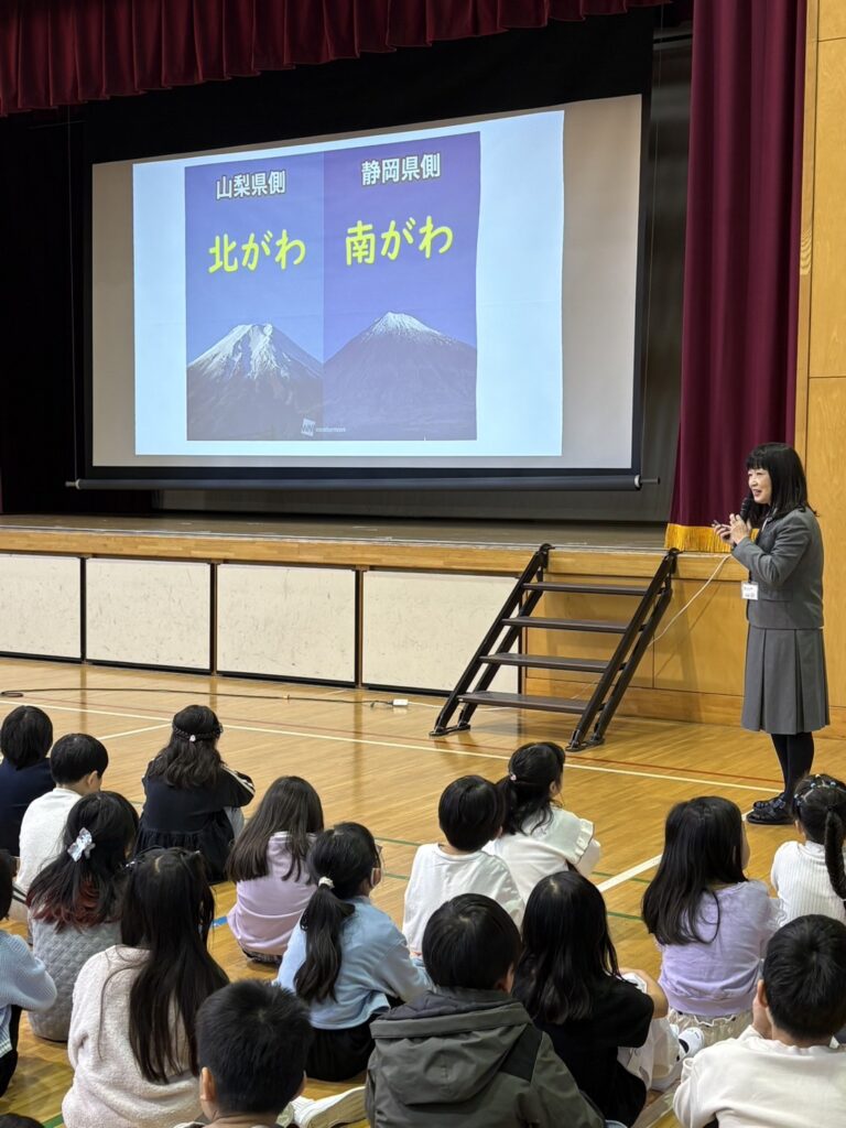 第3学期始業式 1月8日(木)3学期の始業式を体育館で行いました。校長からは、富士山の山梨県側と静岡県側の2枚の写真を見せ、それぞれどちら側から見た写真なのかとその理由を聞く問題が出されました。学習でも生活でもよく考える3学期にしてほしいと話しました。