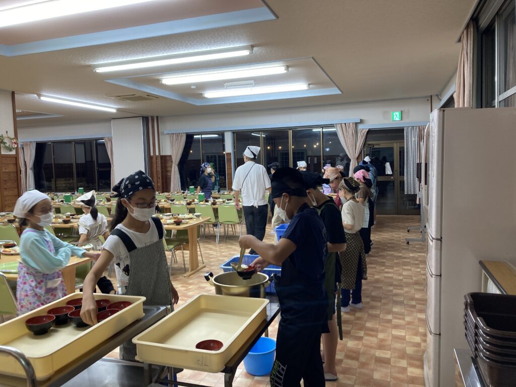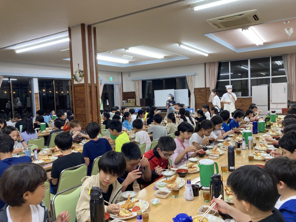 この後、生活班ごとにお風呂に入ったり、ハガキを書いたりしました。18時過ぎからは食事係が夕食の用意をしました。、エビフライ、ポテトサラダ、カニグラタン、牛皿などの食事をモリモリ食べました。