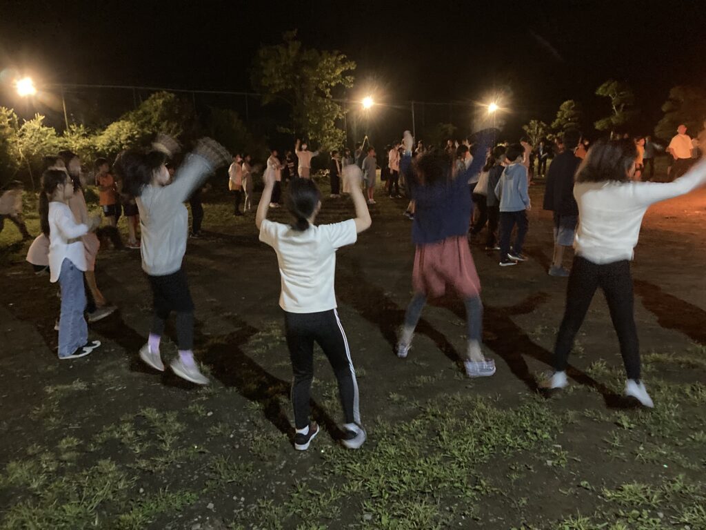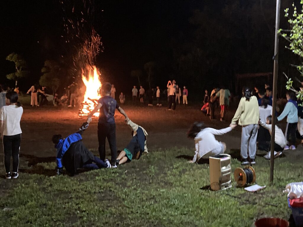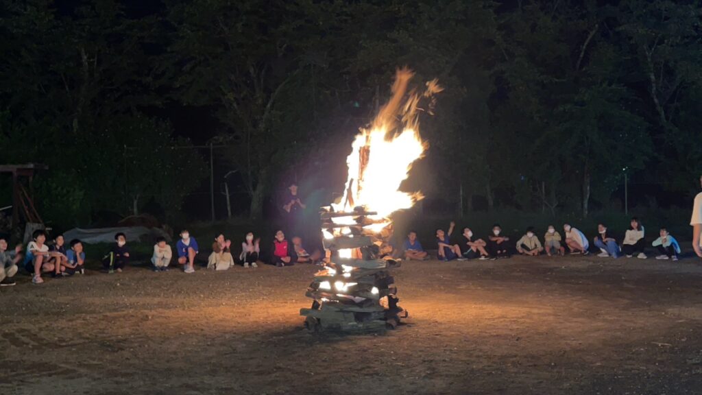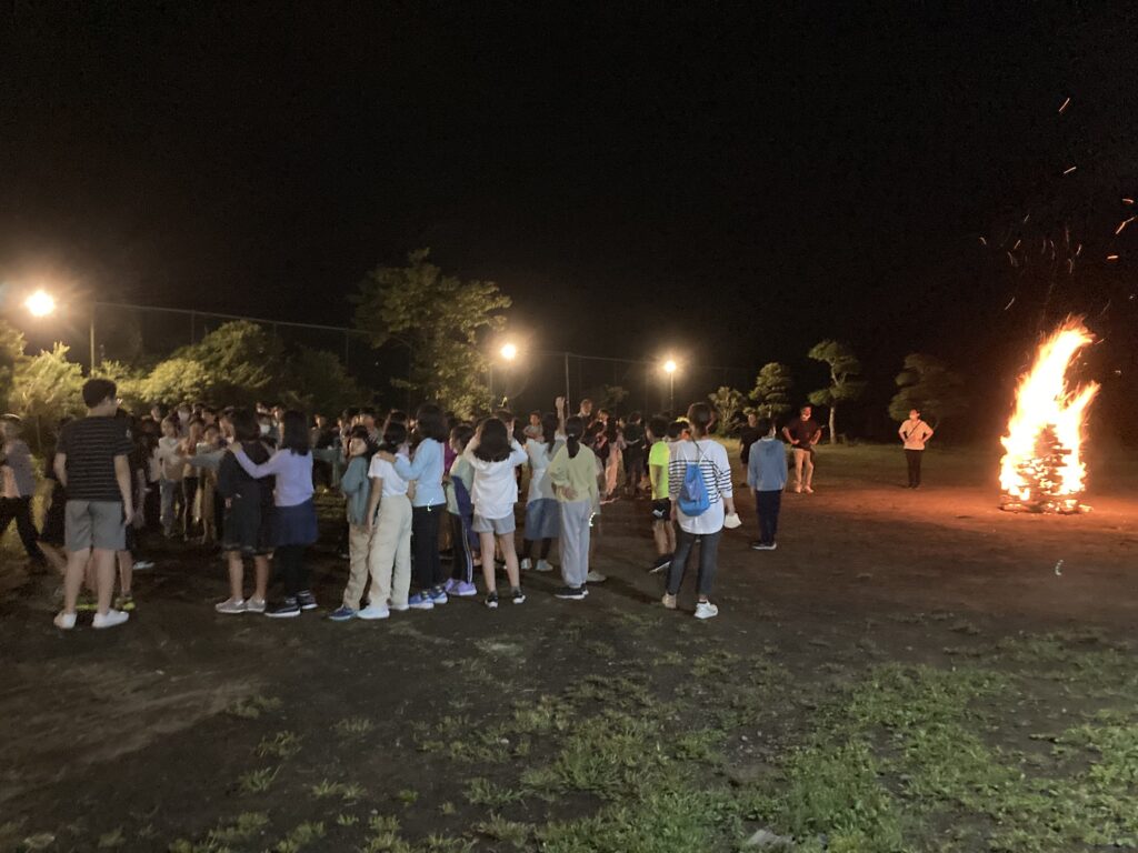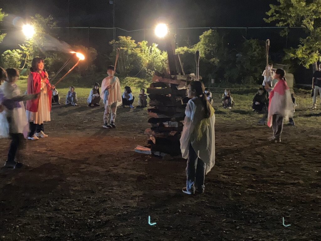 夜7時半からは、楽しみにしていたキャンプファイヤーです。火の神がやってきて、学級ごと1組は永炎の火、2組は希望の火、3組は絆の火、4組は勇成の火を授けました。その後は、レク係がゲーム、ダンス、歌などで大いに盛り上げました。心に残る楽しい時間になりました。