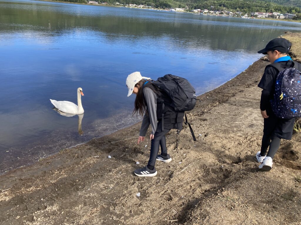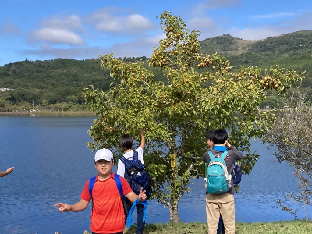 9時にパノラマ台ハイキングを引率してくださるガイドさんが来て、ひびき広場でハチに遭遇した際の身の守り方などレクチャーを受けました。最初に山中湖に寄り、ヤマナシやフジアザミなどの植物やハクチョウを見ました。