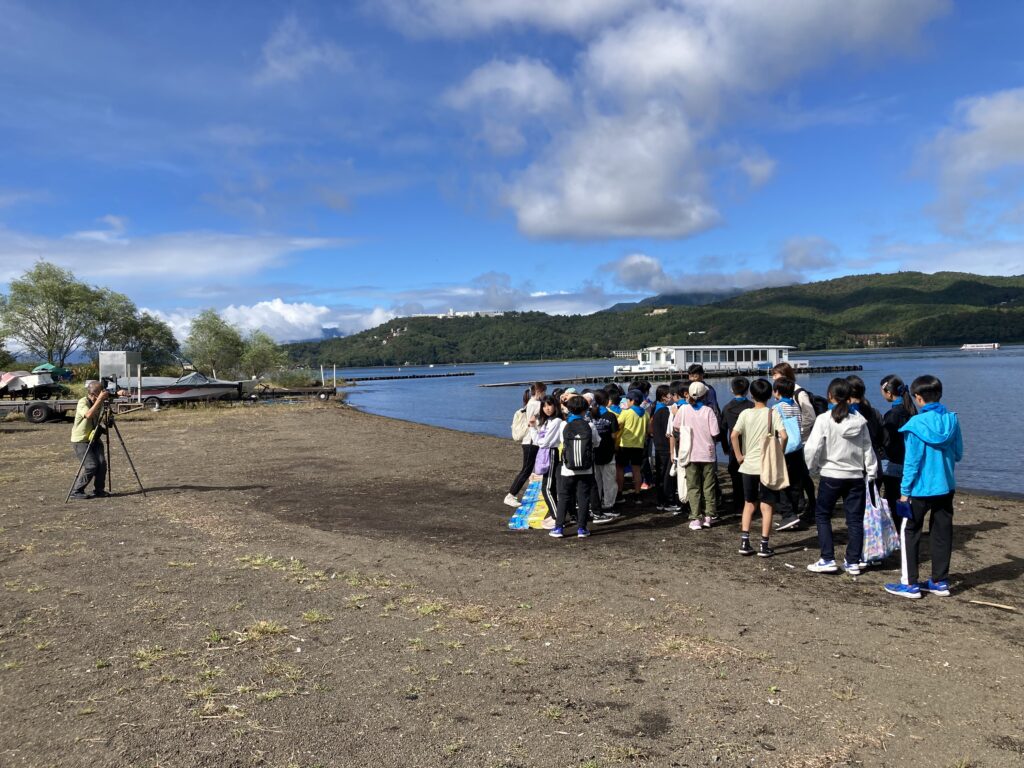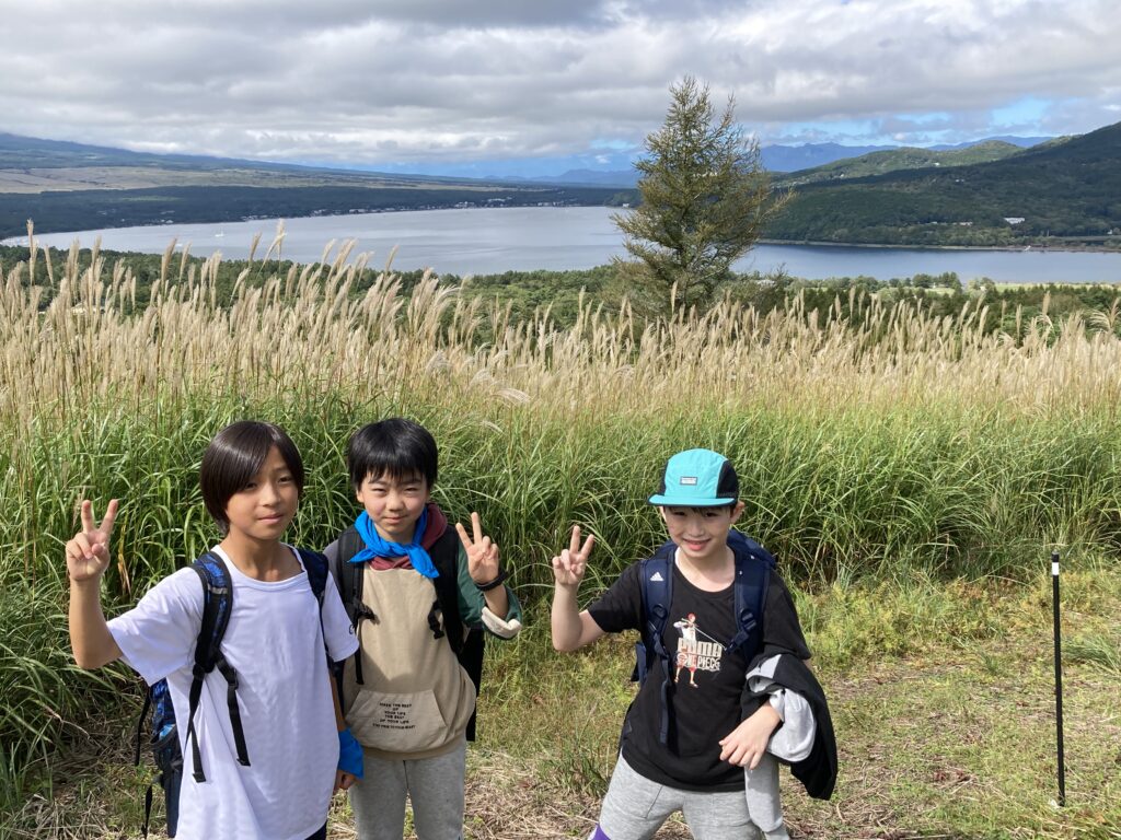 人数が多いため、買い物とクラス写真撮影の2組ずつに分かれて行いました。天気か回復しきらきらした山中湖をバックにしたクラス集合写真が撮れました。