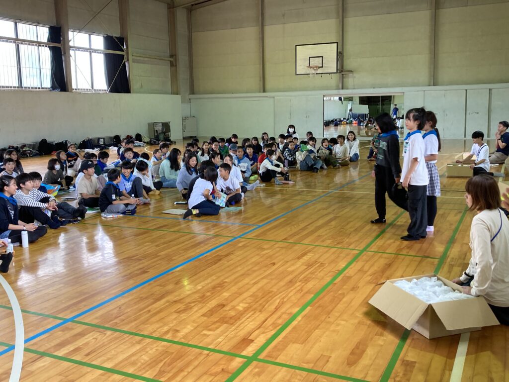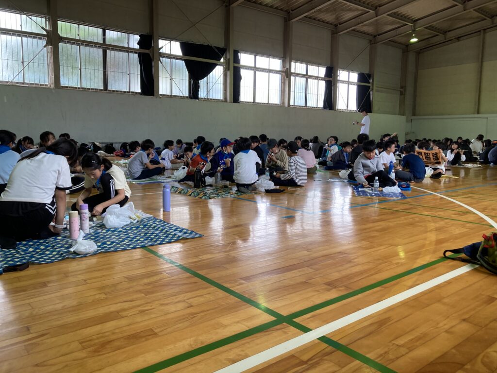 お昼は、きららのひぴき広場でおにぎり弁当を食べる予定でしたが小雨が降ってきたので急遽体育館でシートを敷きグループで食べることにしました。ハイキングでたくさん栗を拾った子が見せてくれました。