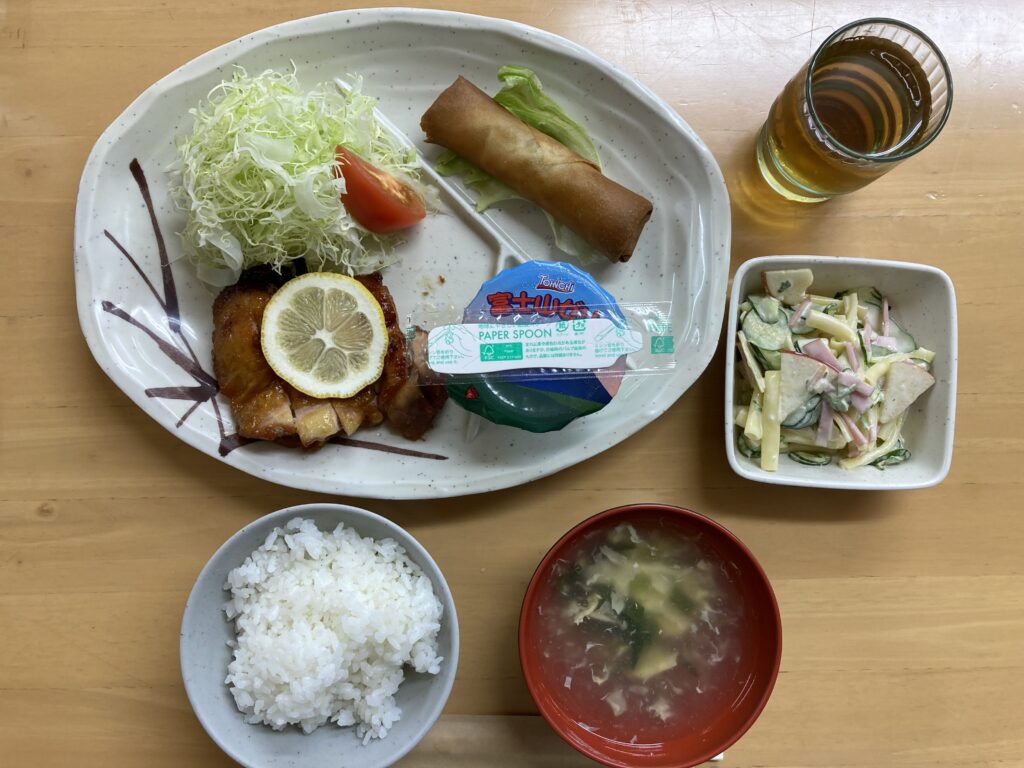 18時過ぎに全員お風呂が終了し、食事係の準備が始まりました。食事係は、一心不乱に仕事をして予定より10分も早く、いただきますができました。夕食メニューです↓。