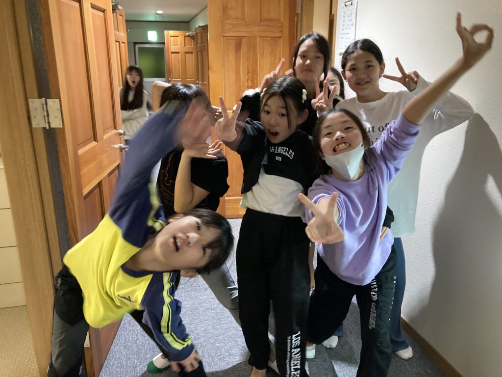 この後、今度は、学年集合写真をひびき広場で撮り、宿舎に戻りました。次はお風呂の時間です。16時前、1番はじめに入ったグループが「1番風呂最高とあがって来ました。」