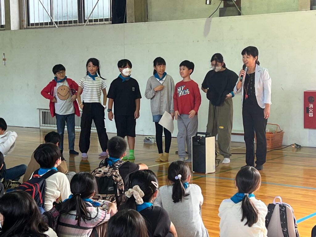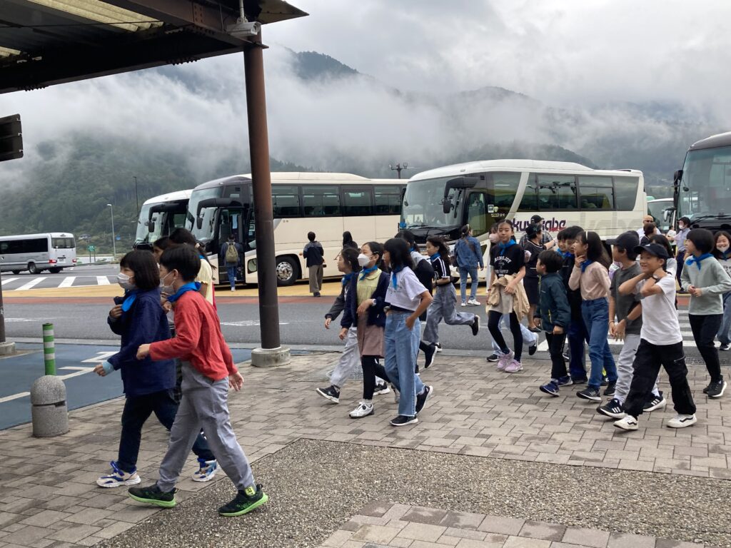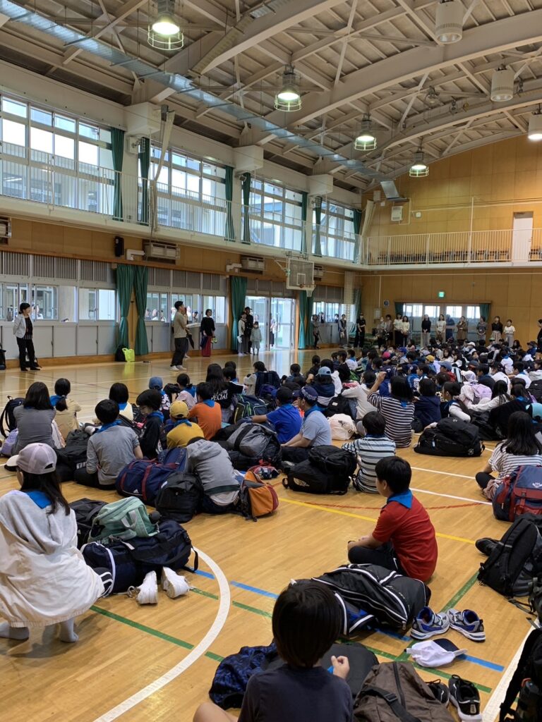 小雨のため体育館で出発式をし、8時25分に学校をスタートしました。