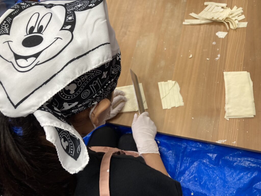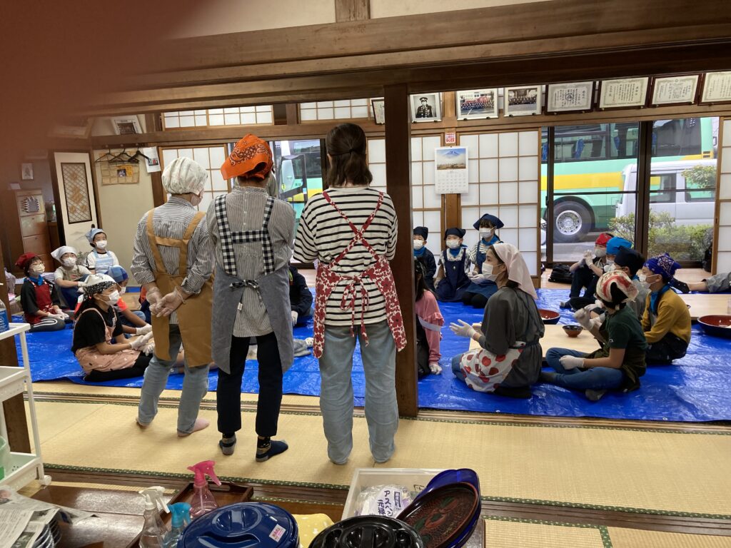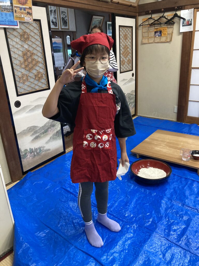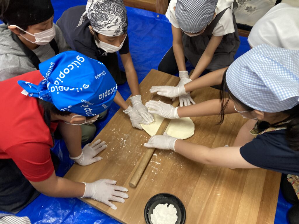ほうとうづくりの民宿に着きました。エプロン、三角巾、マスク、手袋をして準備万端です。民宿の人のレクチャーを受けて麺づくりスタートです。
