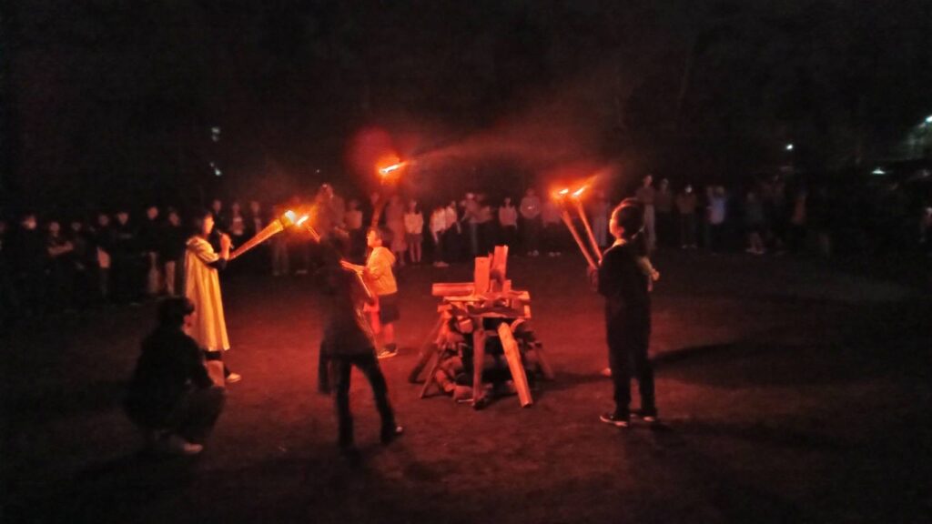 ご馳走様をして、19時半からキャンプファイヤーを行いました。レク係はもちろんキャンプファイヤーを学年全体で盛り上げようと学校にいるときから練習を重ね本番を迎えました。火の神からの火の伝授の後、1組はNO.1の火、2組は幸せの火、3組は笑いの火、4組は努力の火という願いを込めて着火しました。