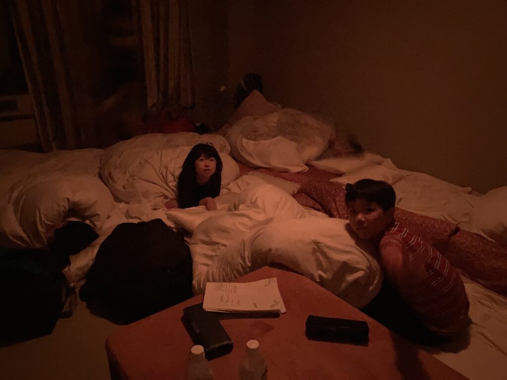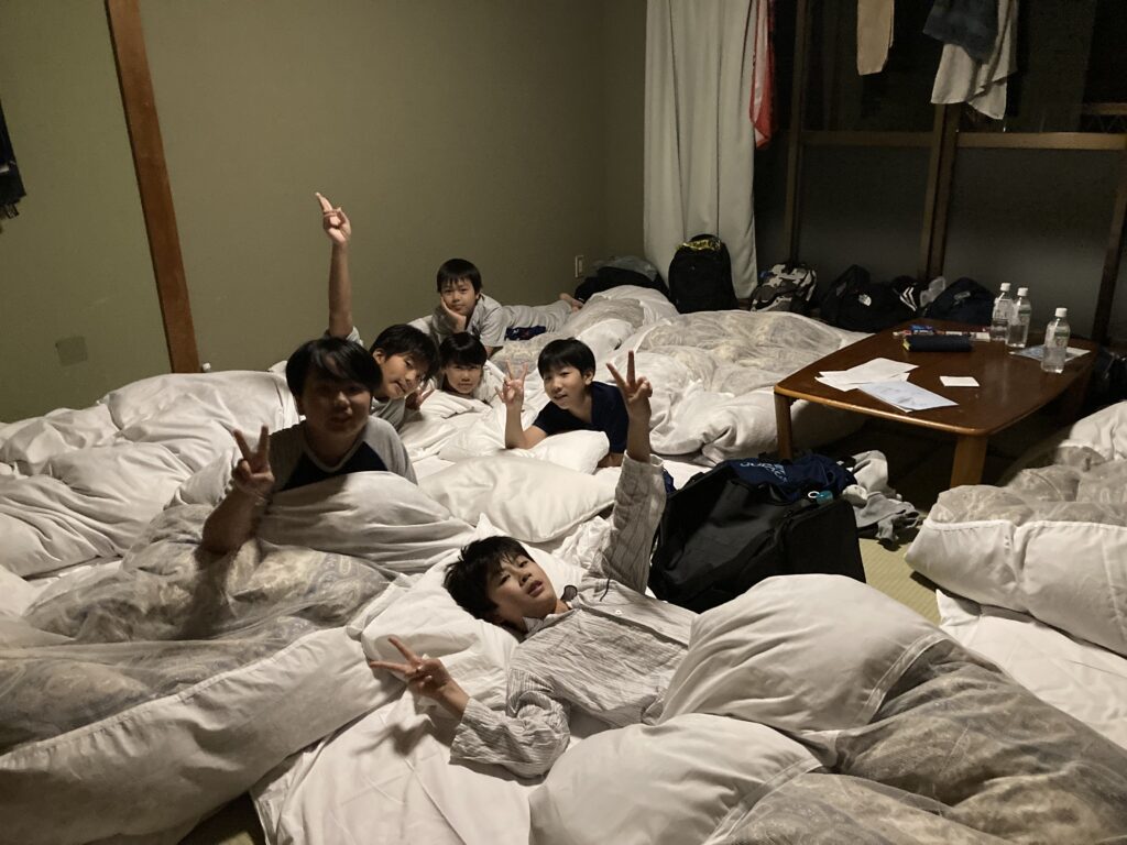 この後、部屋に戻り就寝準備をしました。学校の仲間との初めての宿泊、消灯時間の9時半になりました。こんな感じでした。