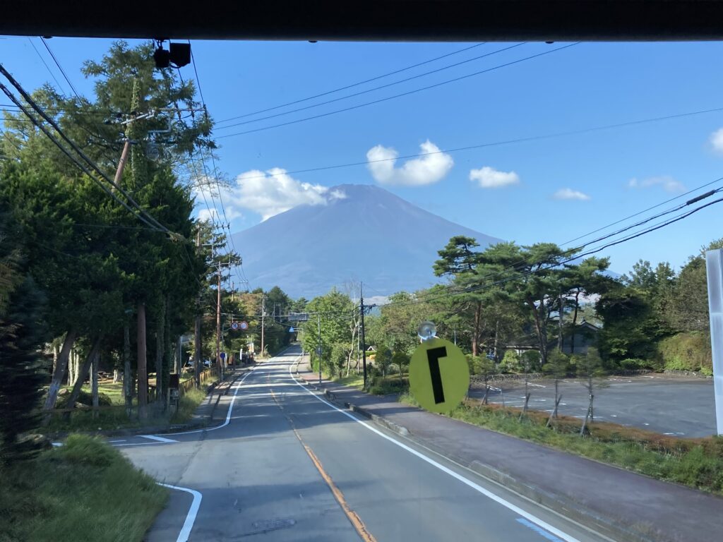 最後の見学場所湧水の里水族館にバスで移動しました。一昨日、昨日は雲に隠れてあまり富士山は見られませんでしたが、今日は、最高のお天気です。バスから雄大な富士山が見えました。