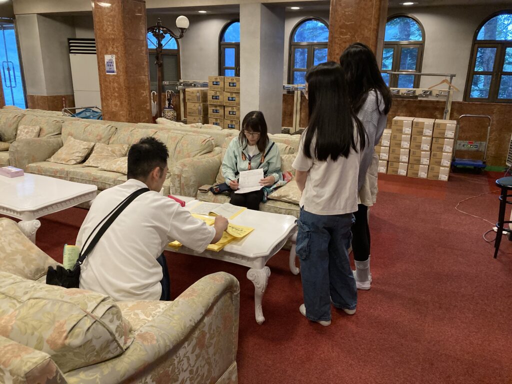 おはようございます。夜、静かに眠っていたお部屋もありましたが、そうではないお部屋もありました。朝も5時位から楽しく過ごすお部屋もあり、元気な様子です。今朝は6時20分に起床しました。保健係が健康カードをロビーの看護師さんに見せに来ています。