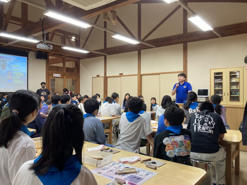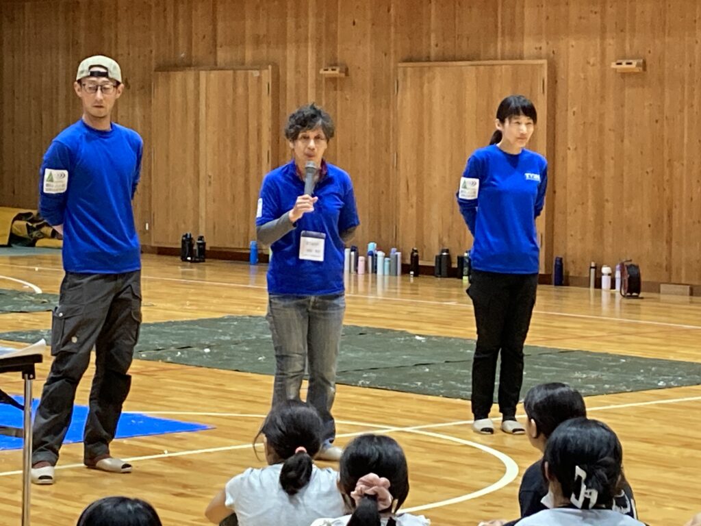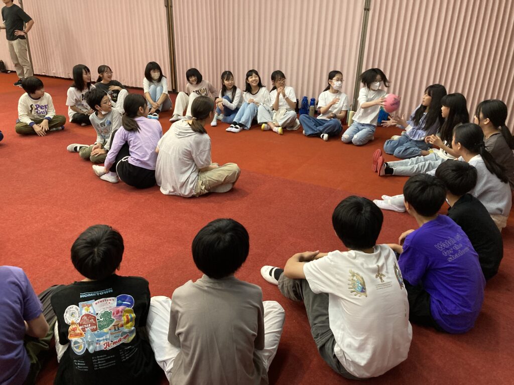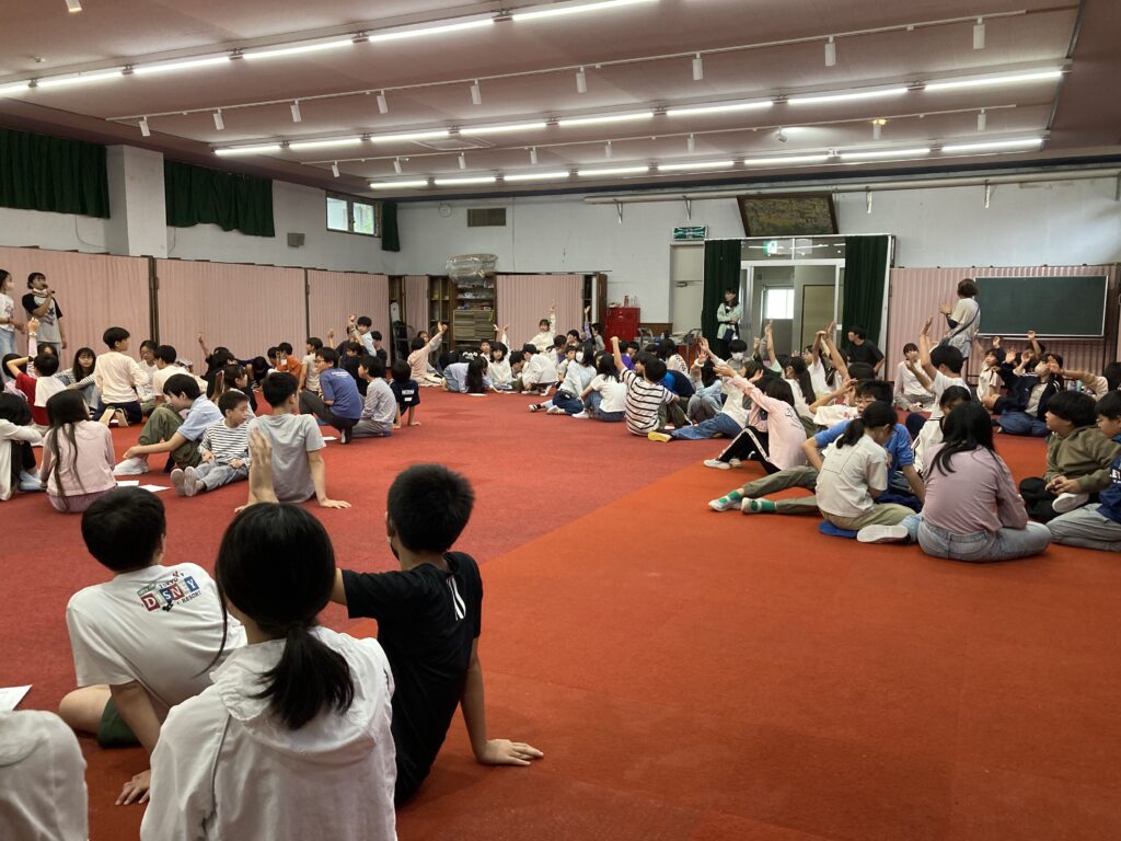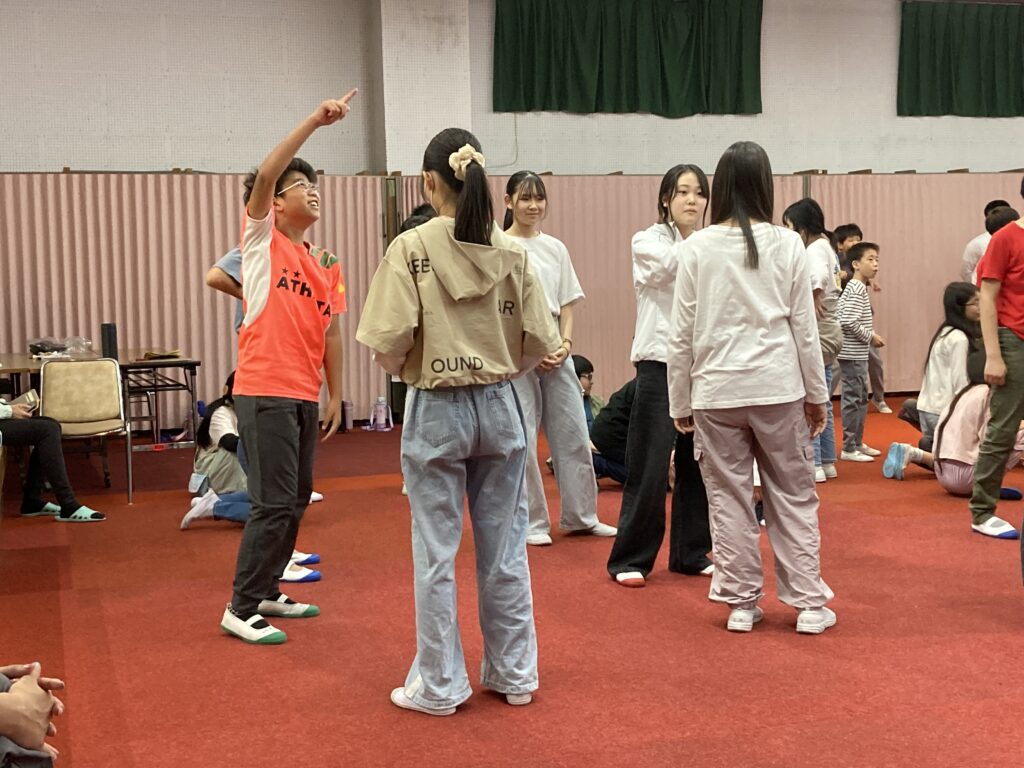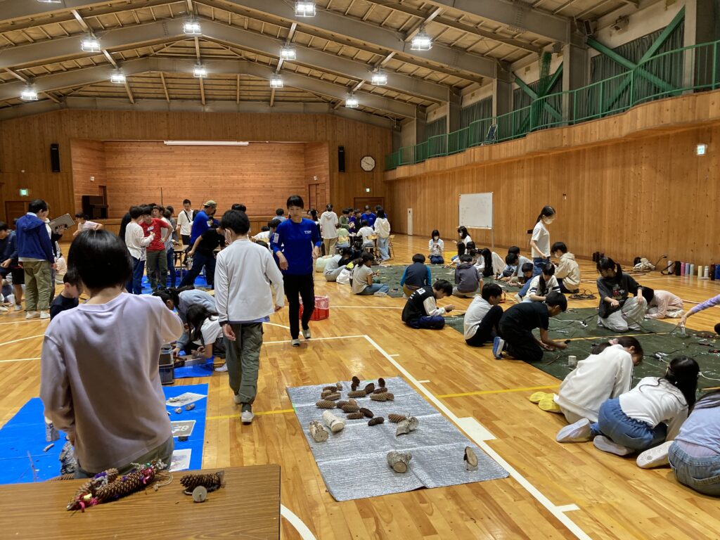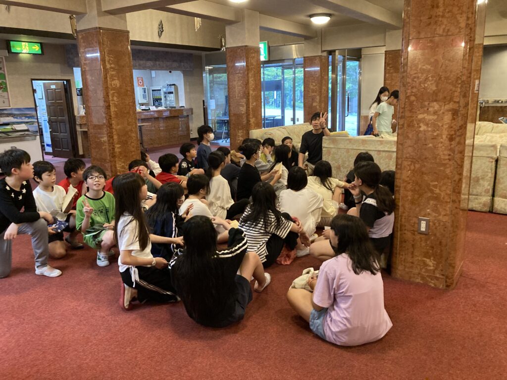 雨は午前中でやむ予報ですが、昨日からの激しい雨で足元がぬかるみ、雨中のスコアオリエンテーリングの状況がよくないことから、体育館での木工クラフト体験、学級・学年集合写真撮影等に代えました。少し余裕の時間ができたので、コンベンションホールで楽しく遊びました。