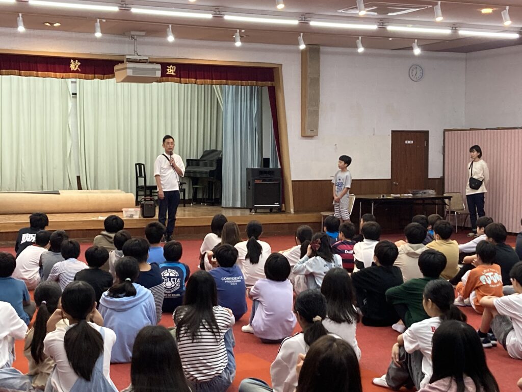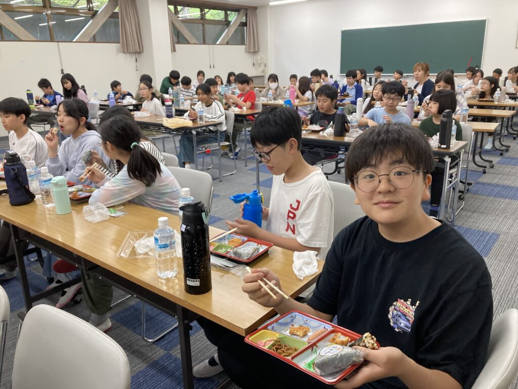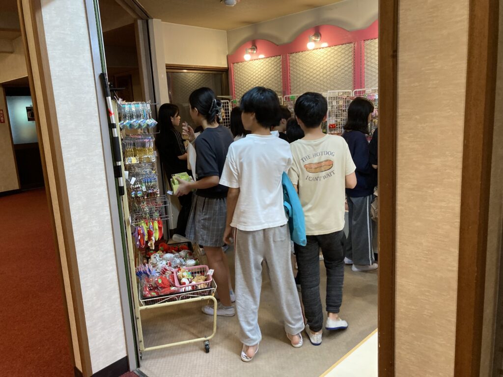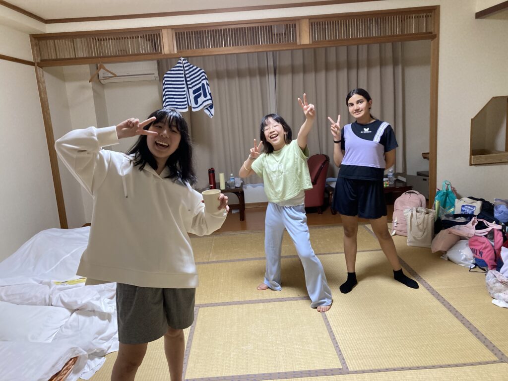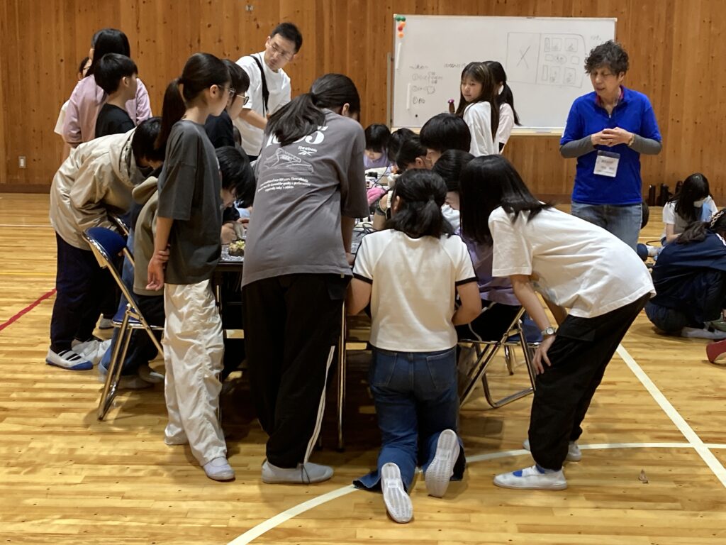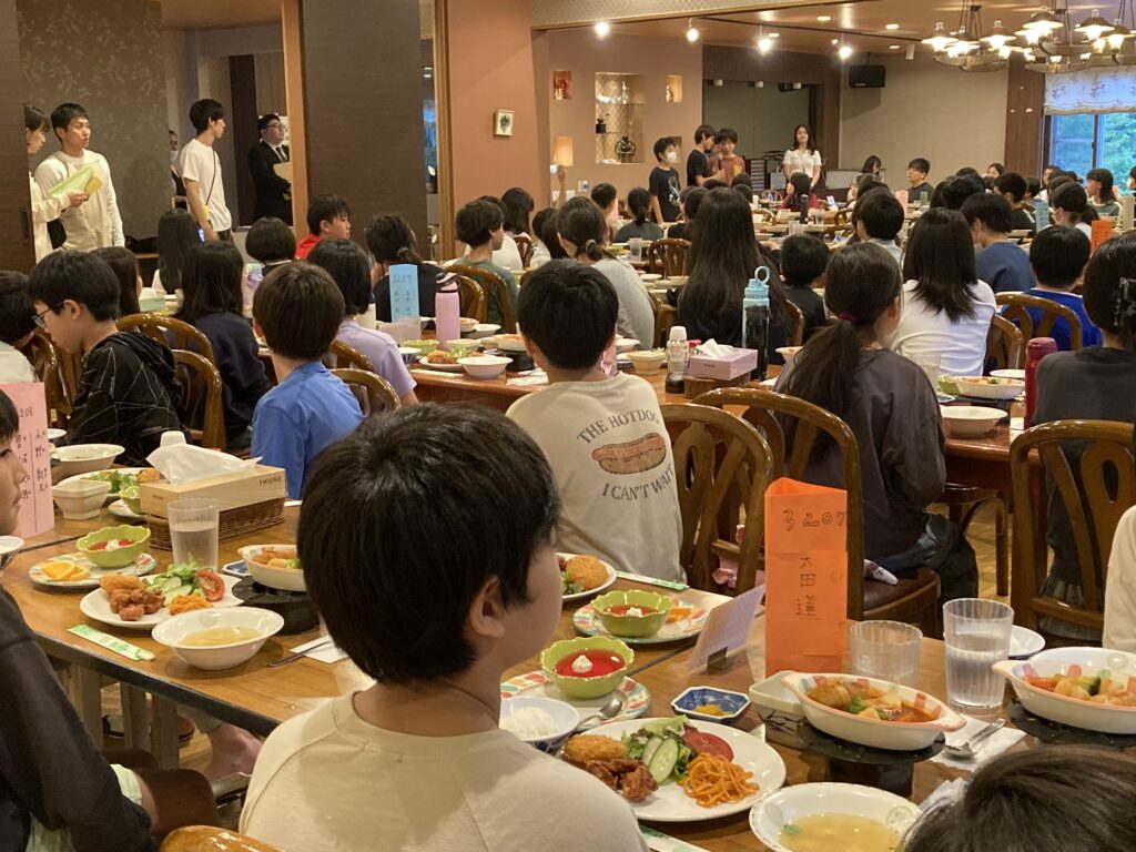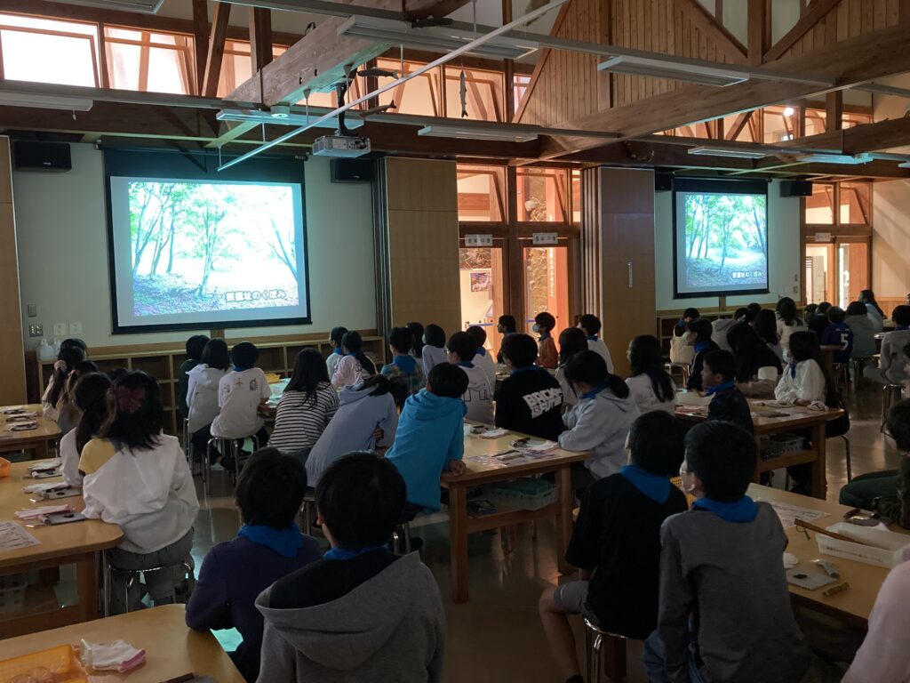 雨は午前中でやむ予報ですが、昨日からの激しい雨で足元がぬかるみ、雨中のスコアオリエンテーリングの状況がよくないことから、体育館での木工クラフト体験、学級・学年集合写真撮影等に代えました。少し余裕の時間ができたので、コンベンションホールで楽しく遊びました。